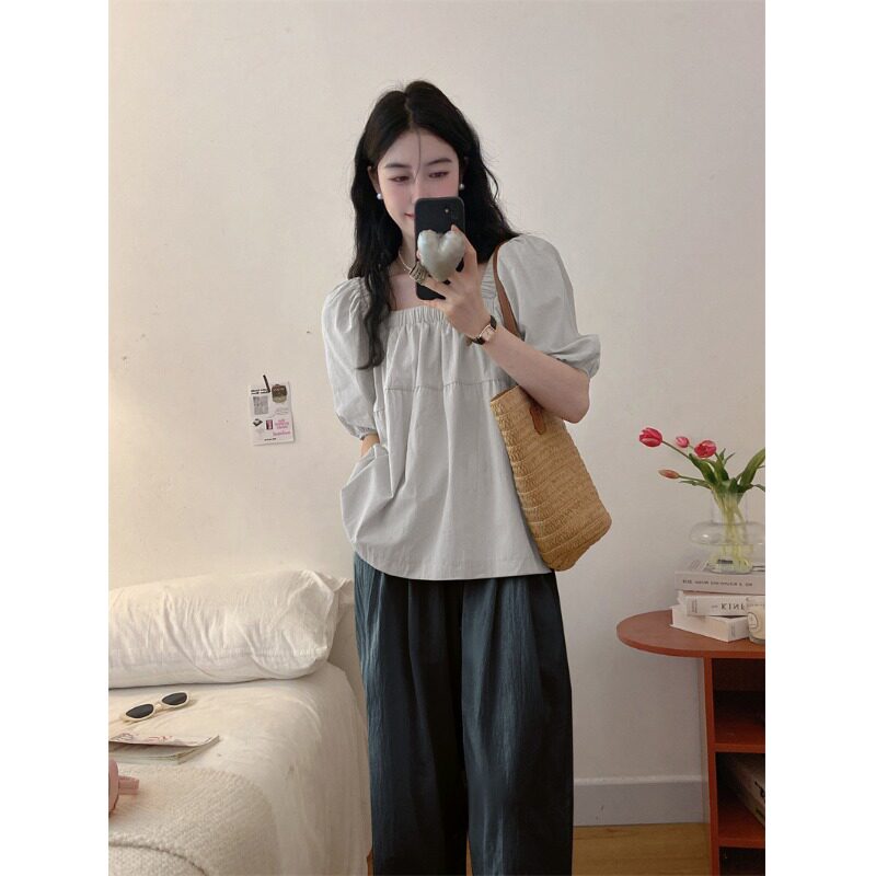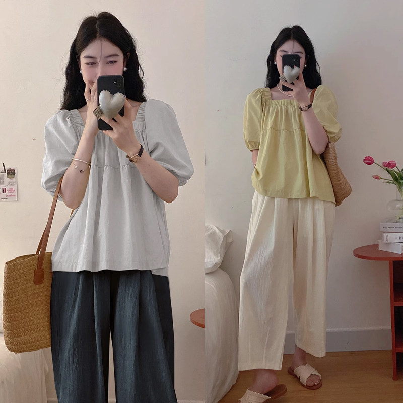 Модная рубашка, штаны, комплект, большой размер, квадратный вырез, рукава фонарики, высокая талия, по фигуре