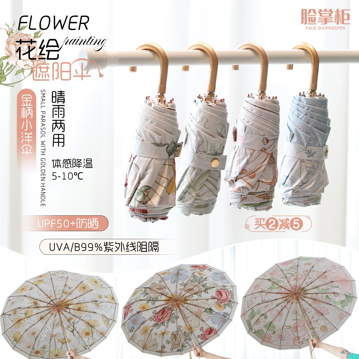 Лицо девушка избранные цветы окрашены и дождь, двухцелевой зонтик, 50 % с момента небольшого золота, солнце