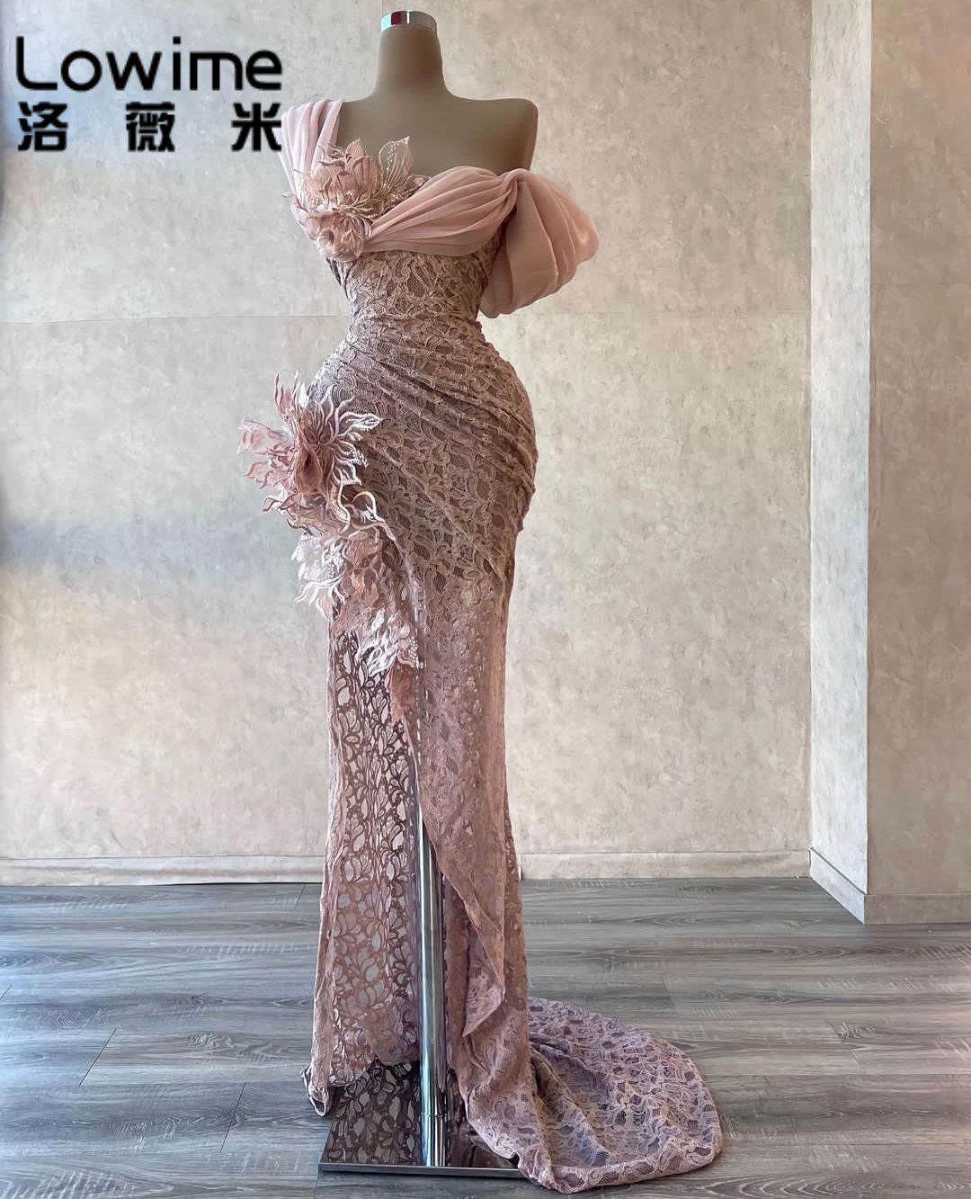 Розовое приталенное кружевное вечернее платье
