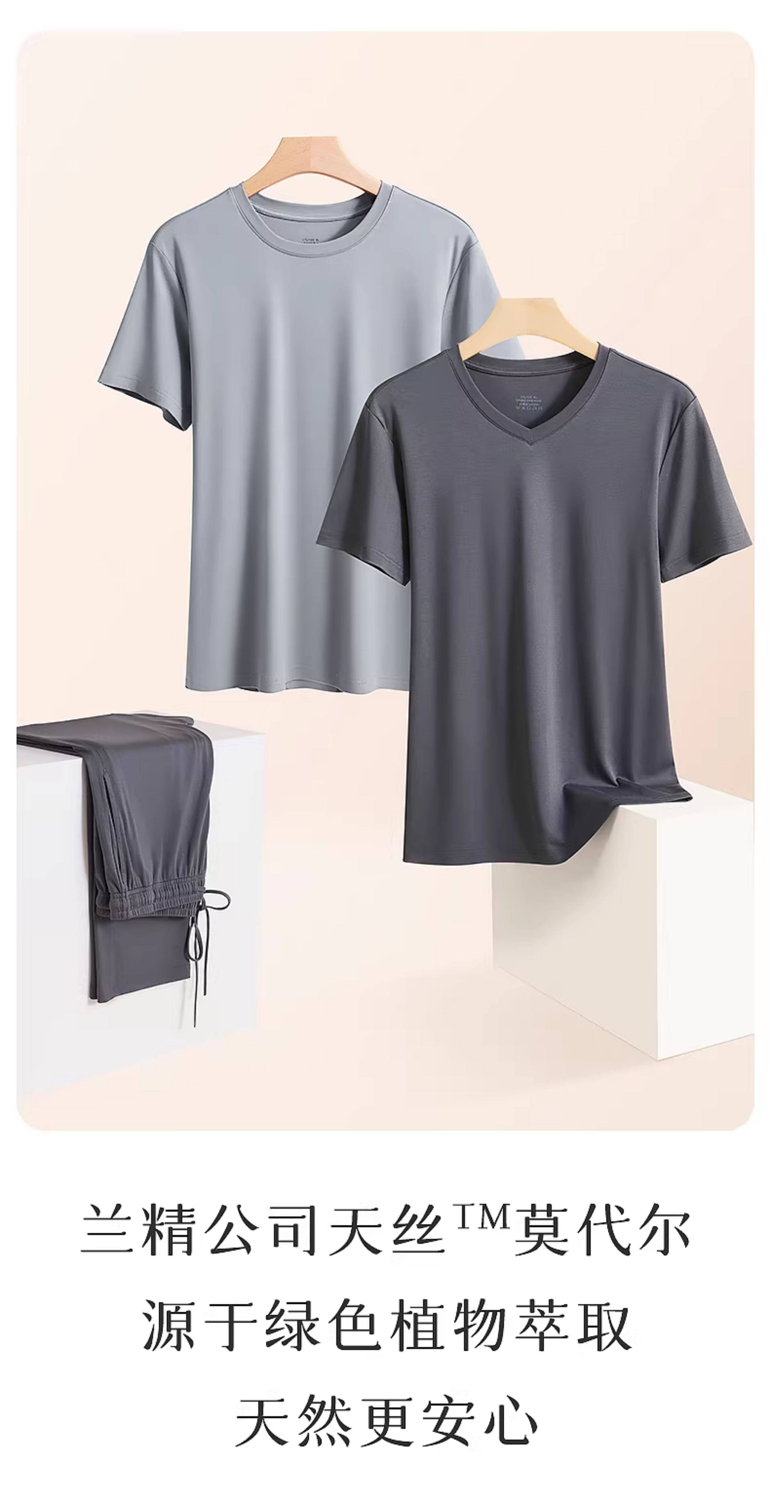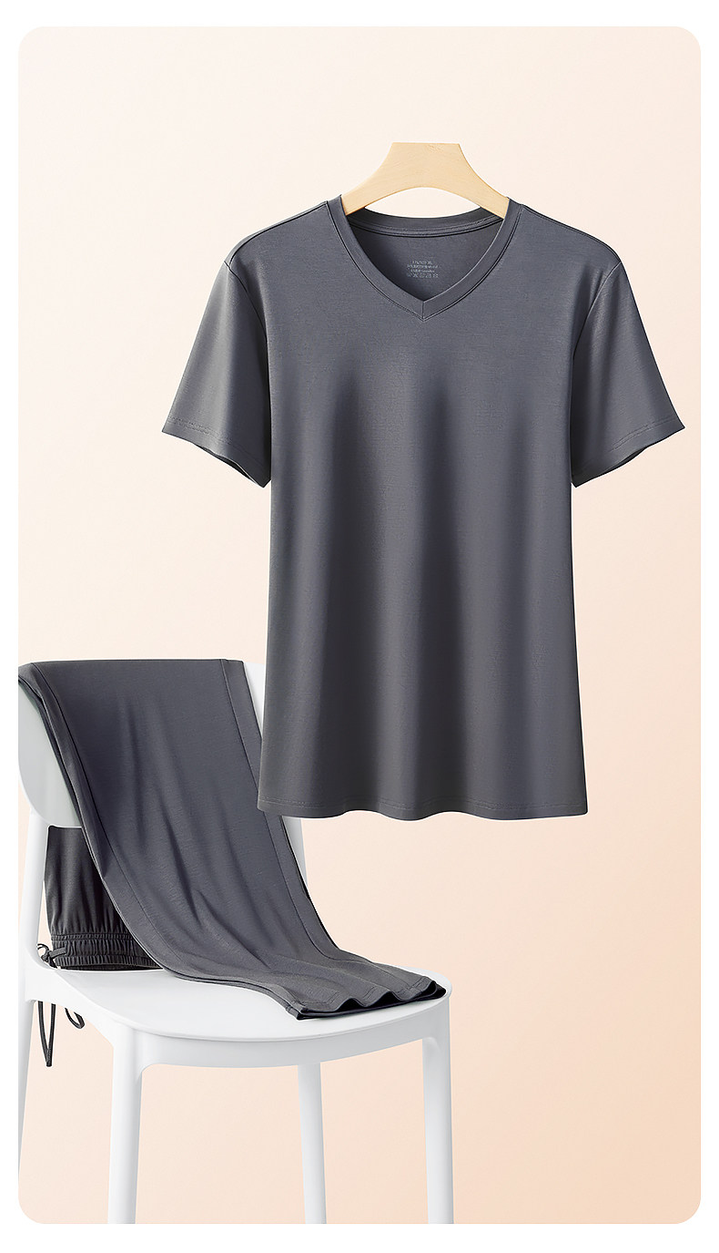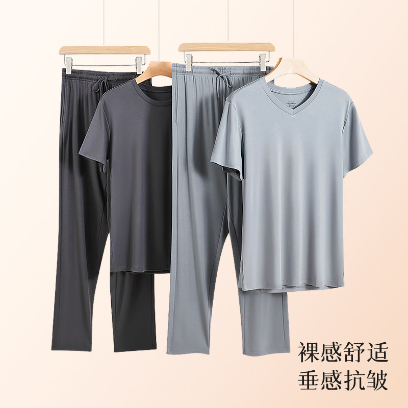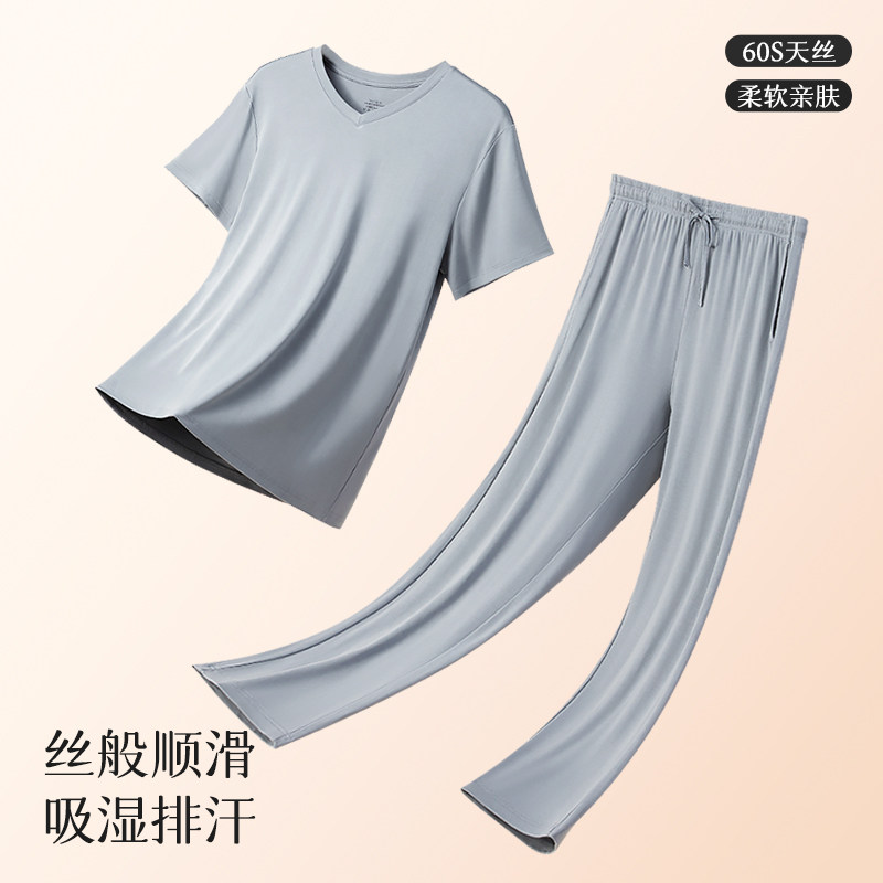 Мужская летняя пижама, тонкие шелковые штаны, комплект, короткий рукав, V-образный вырез