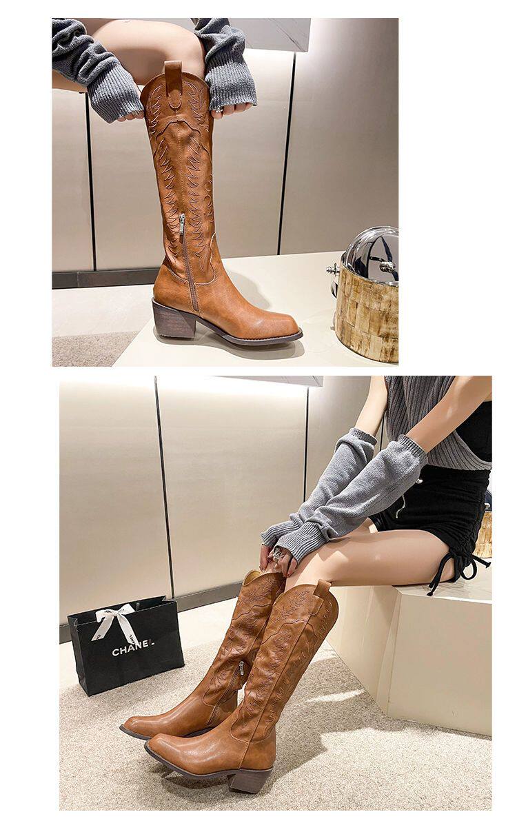 Древние квадратные носки Boots Western Denim Boots Женские вышитые рыцарские ботинки 2025