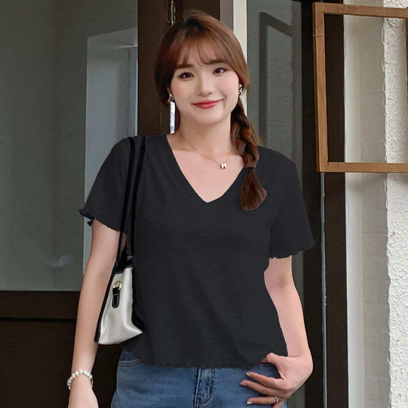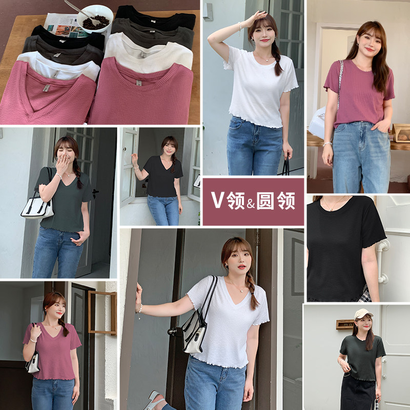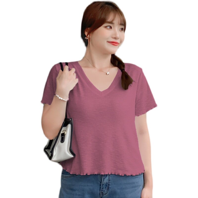 Летняя бамбуковая короткая футболка, большой размер, в корейском стиле, V-образный вырез