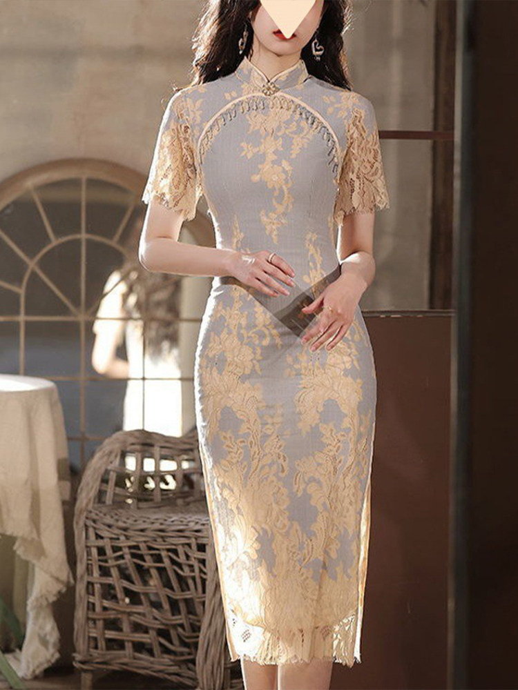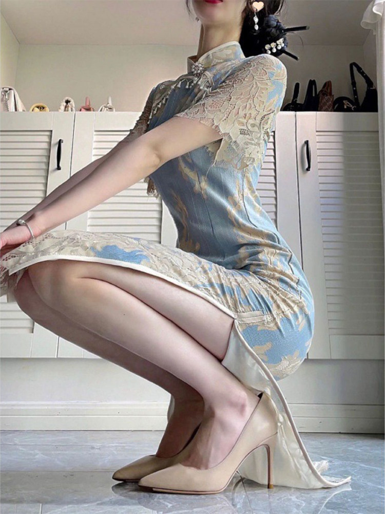Летнее сексуальное синее кружевное ципао, подходит для начинающих
