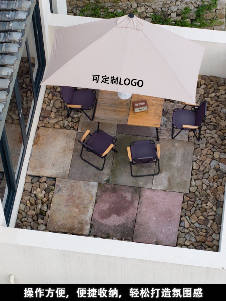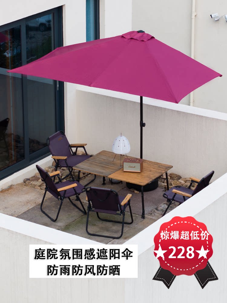 Уличный полубоковой зонт у стены, зонтик во дворе, зонт от солнца на террасе с зелеными растениями на балконе, прямоугольный боковой зонт