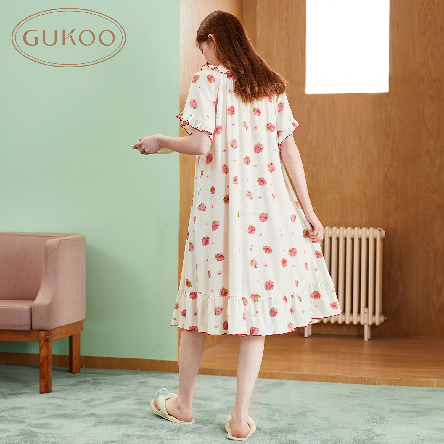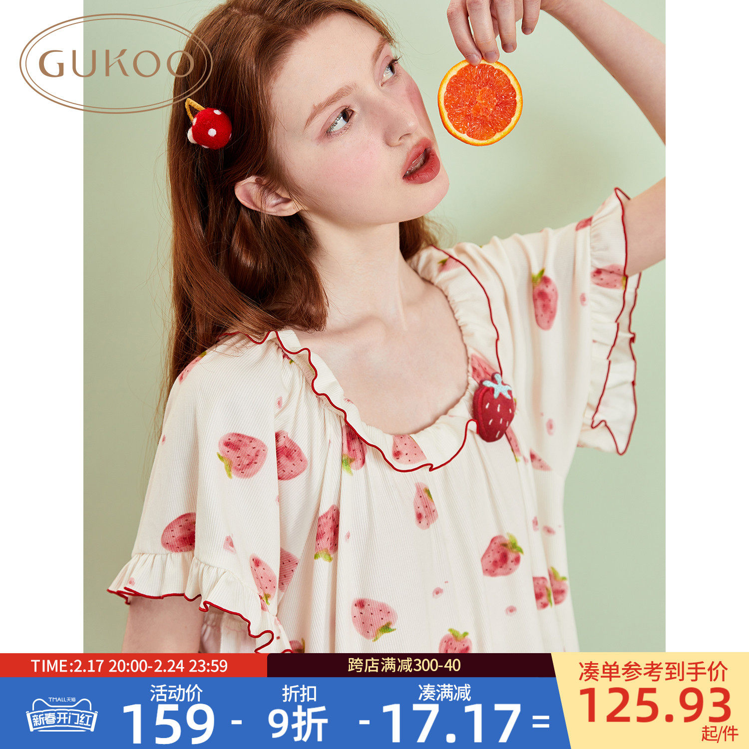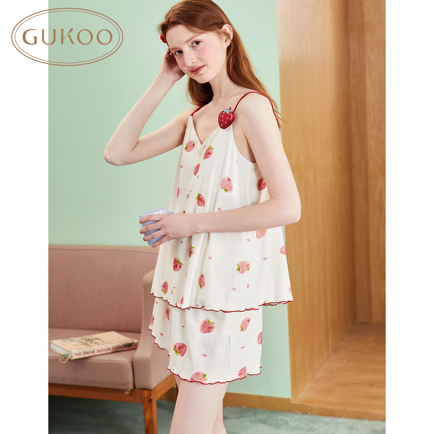 Gukoo/果壳 Весенняя летняя пижама, топ с чашечками, юбка, клубника, эффект подтяжки