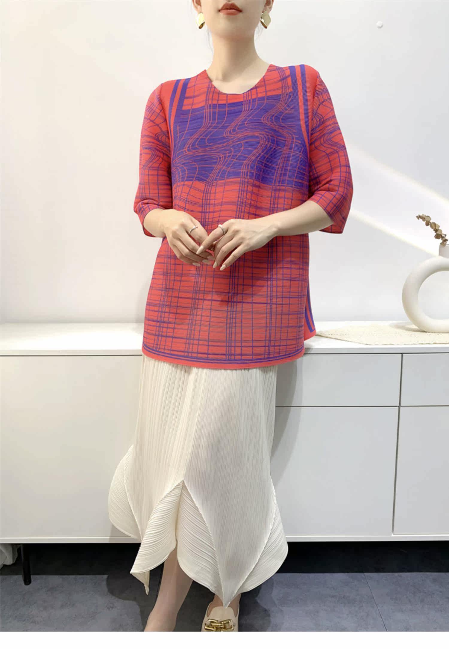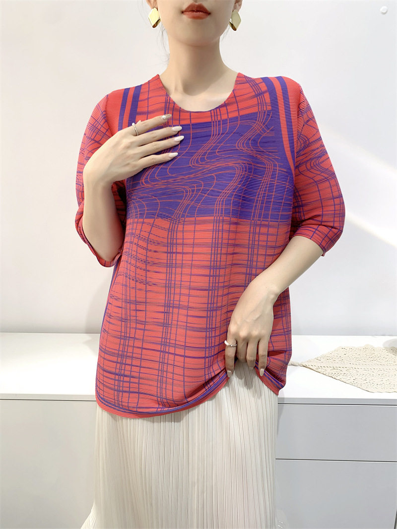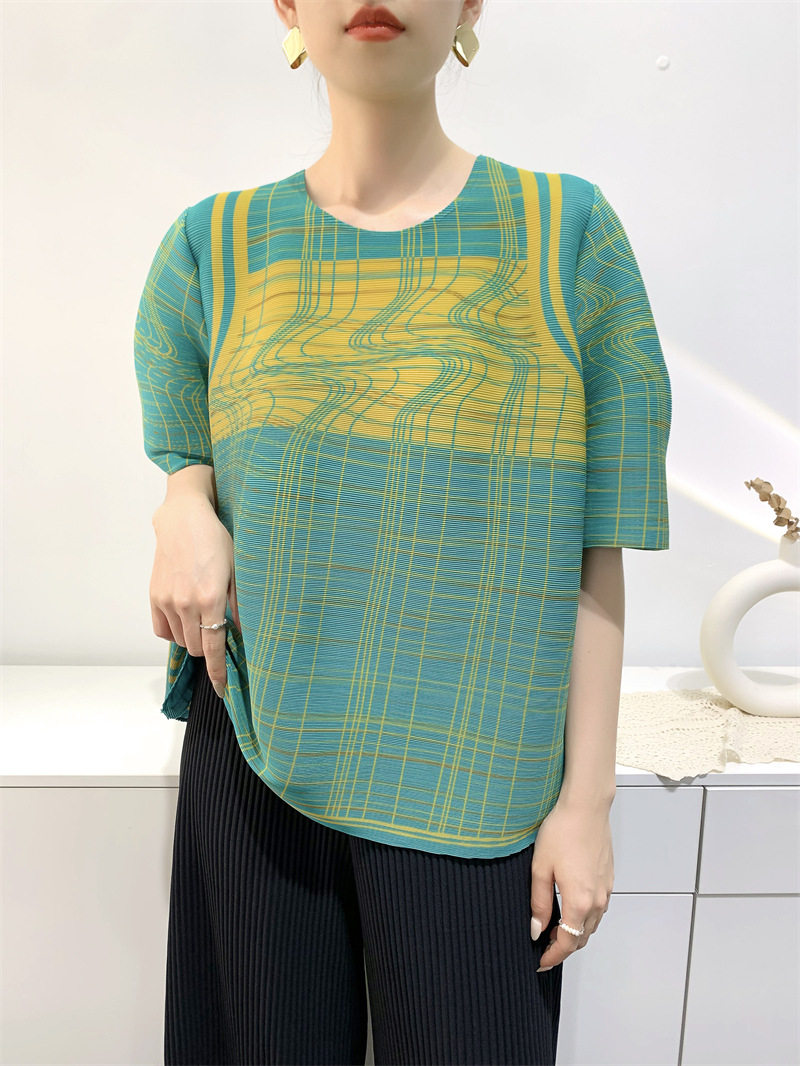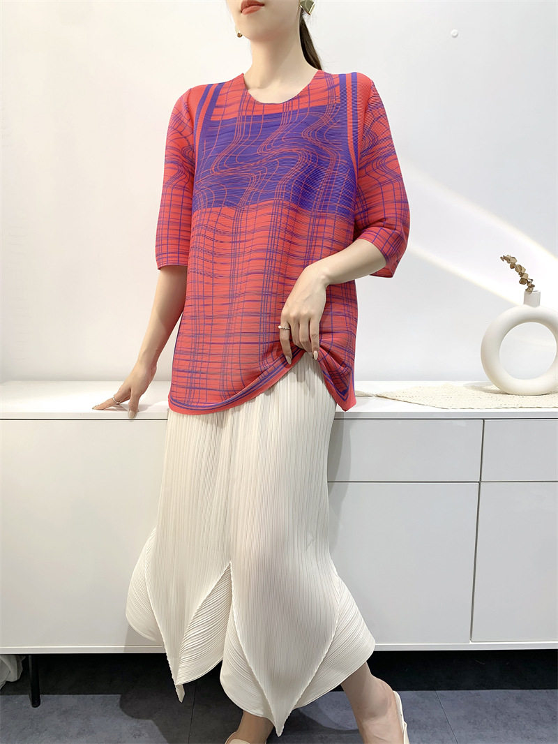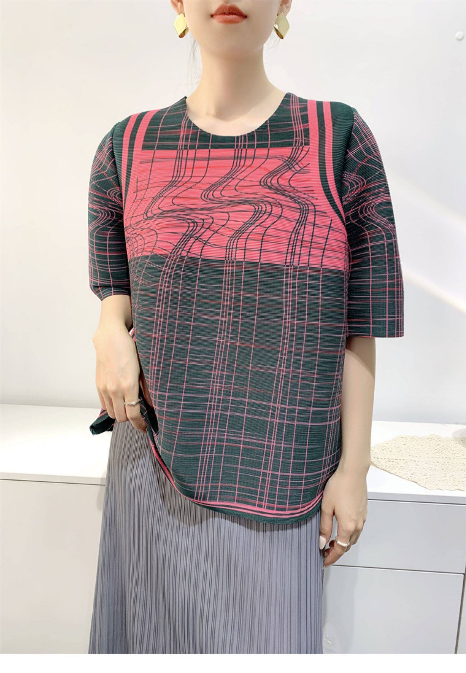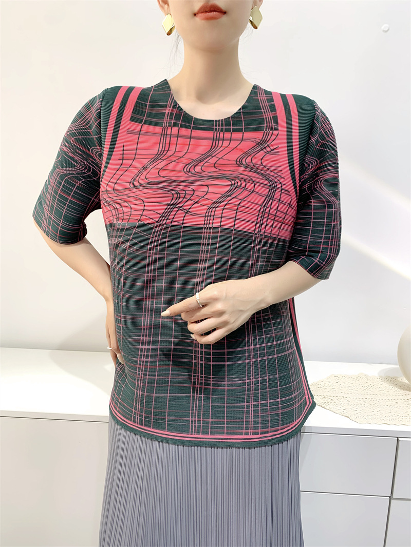 Лето 2024, женская плиссированная футболка с абстрактным принтом, повседневная свободная футболка с зубочисткой, женский топ для мам с коротким рукавом