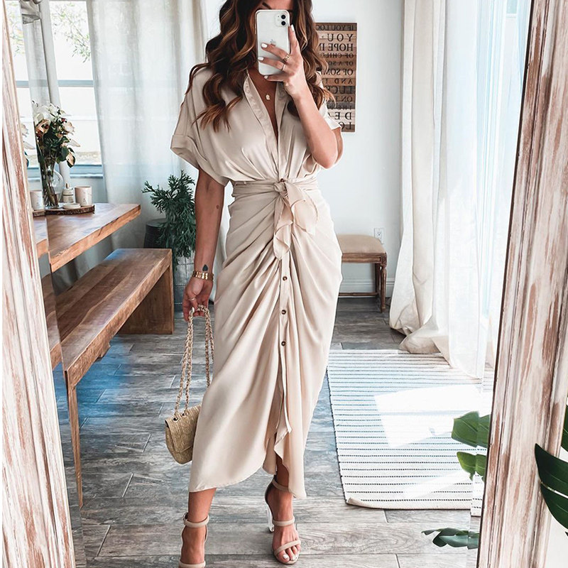 Женщина длинные платья для женщин повседневная пуговица с твердым сараутом новое