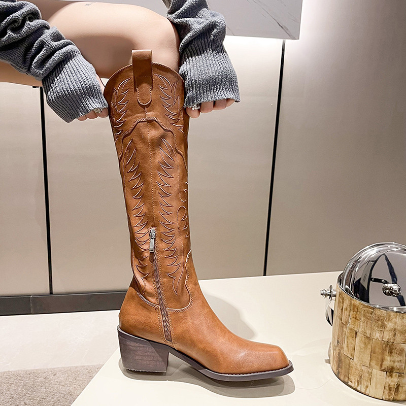 Ковбойские сапоги в стиле вестерн с квадратным носком на толстом каблуке, женские велосипедные ботинки с V-образным вырезом и вышивкой, новинка 2025 года, длинные сапоги с боковой молнией и цепочкой