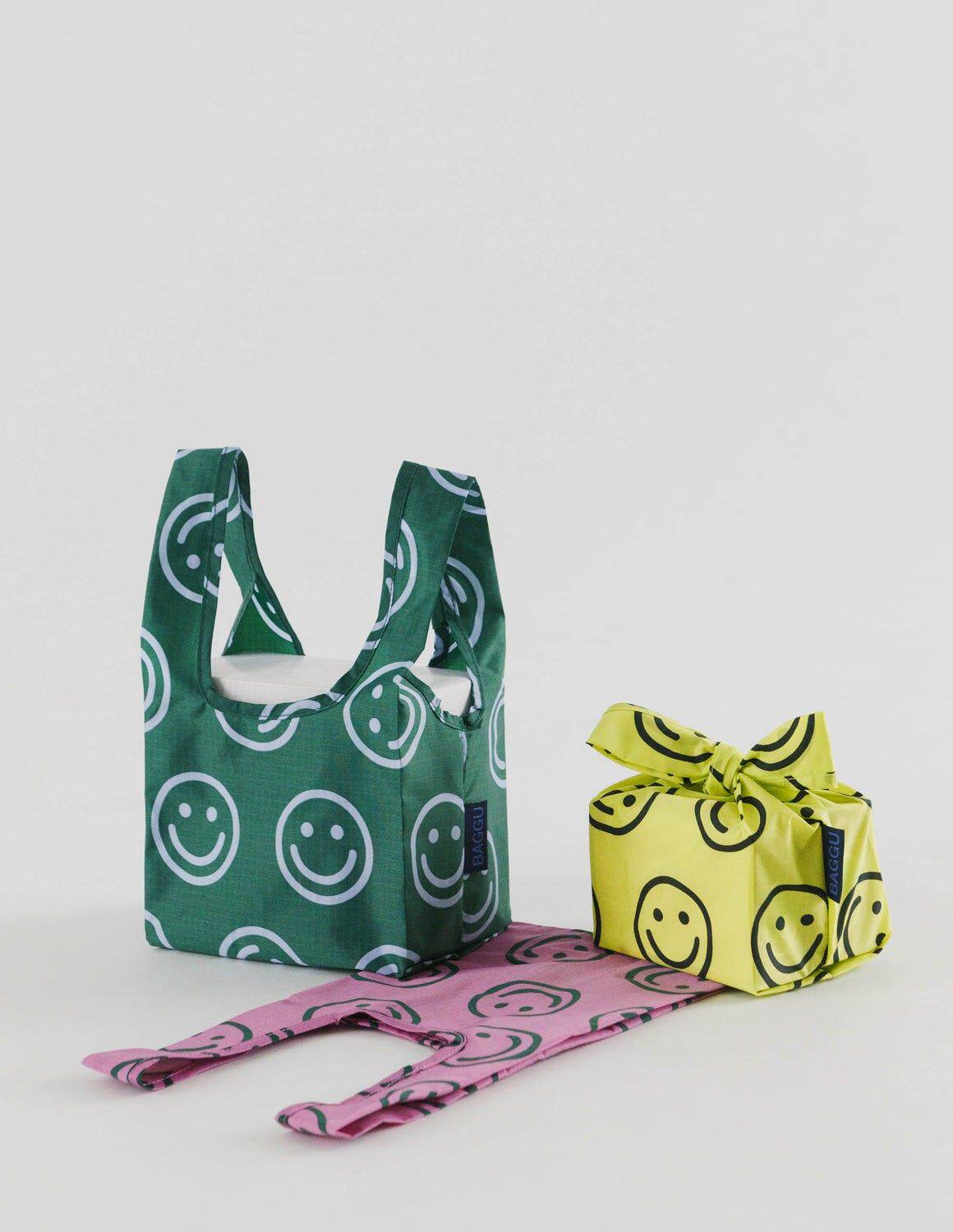 Сумка для торговых точек для защиты окружающей среды Baggu Baggu может сложить экологически чистое смайливое лицо.