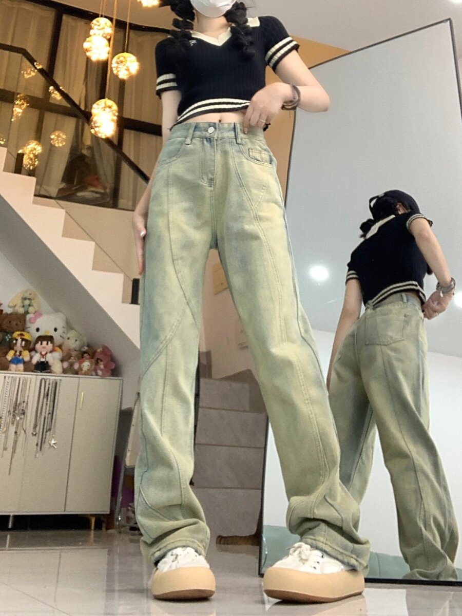 Осенние джинсы, штаны, ретро леггинсы, большой размер, высокая талия, в американском стиле, свободный прямой крой