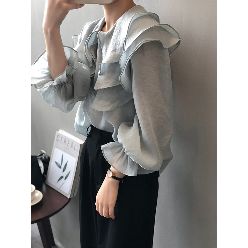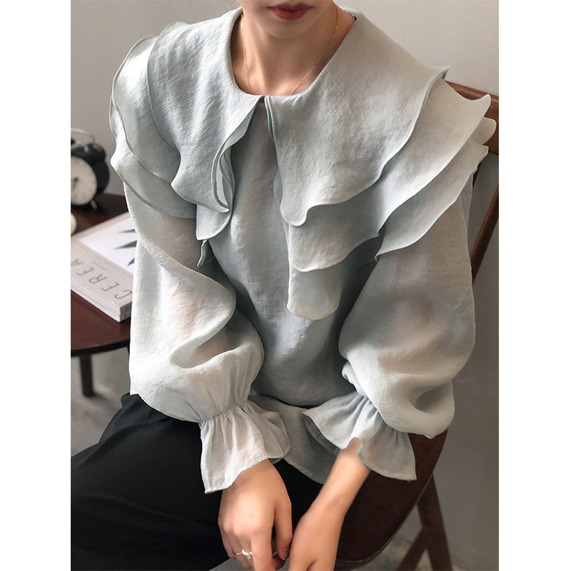 Синяя рубашка, кукла, рукава фонарики, кукольный воротник, в западном стиле