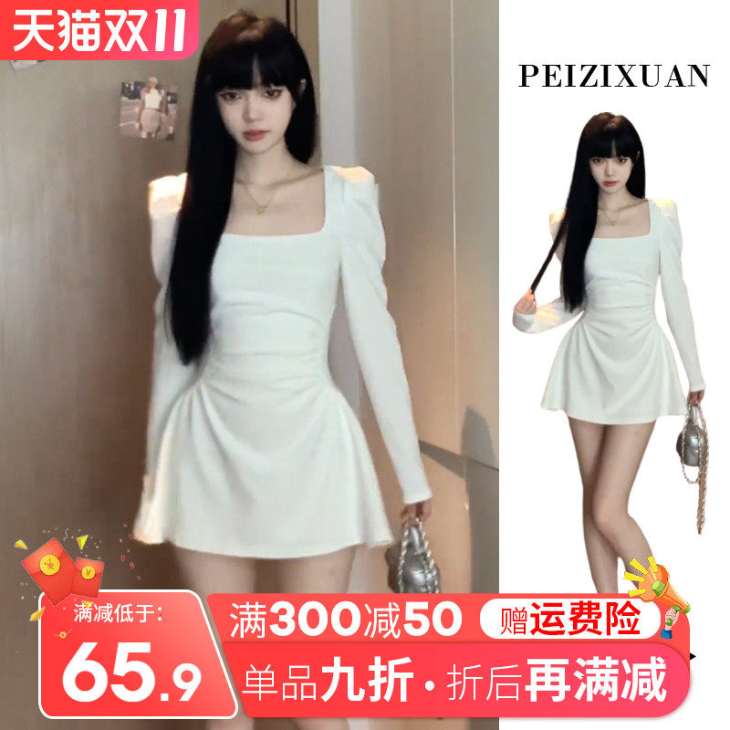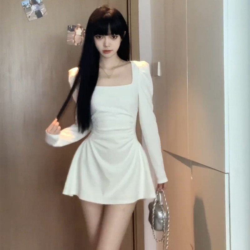 Белый осенний лонгслив, осеннее платье, приталенный корсет, мини-юбка, изысканный стиль, французский стиль, квадратный вырез, подходит для подростков