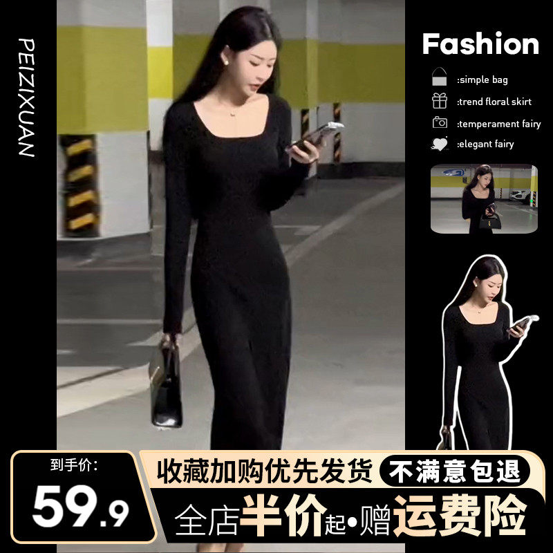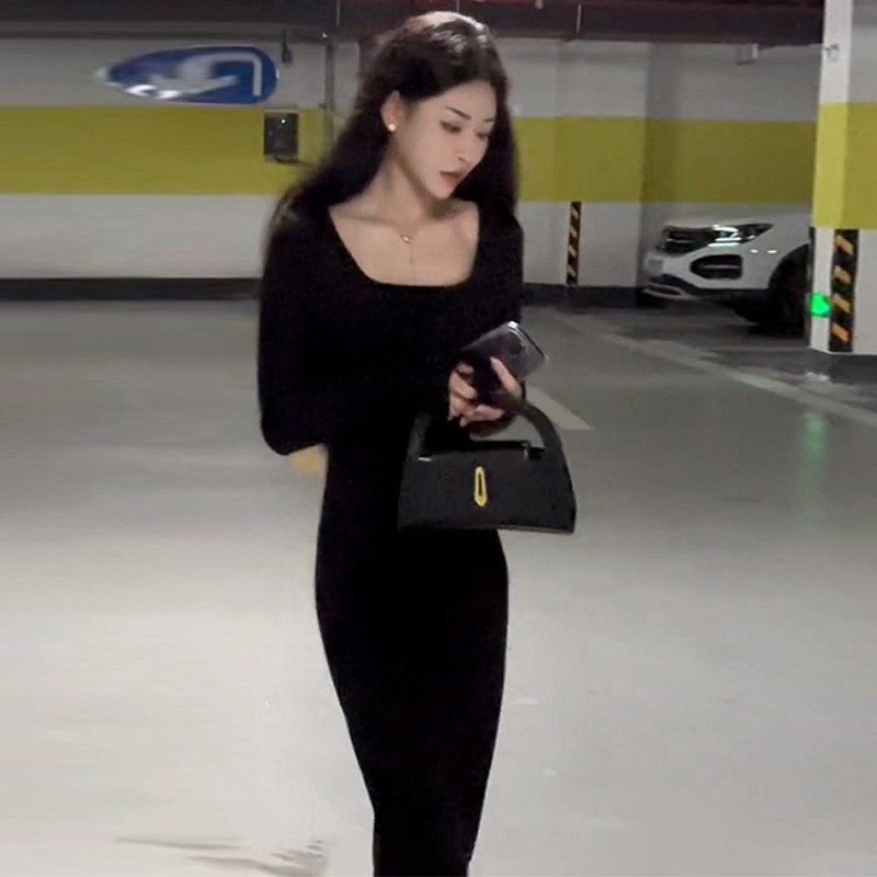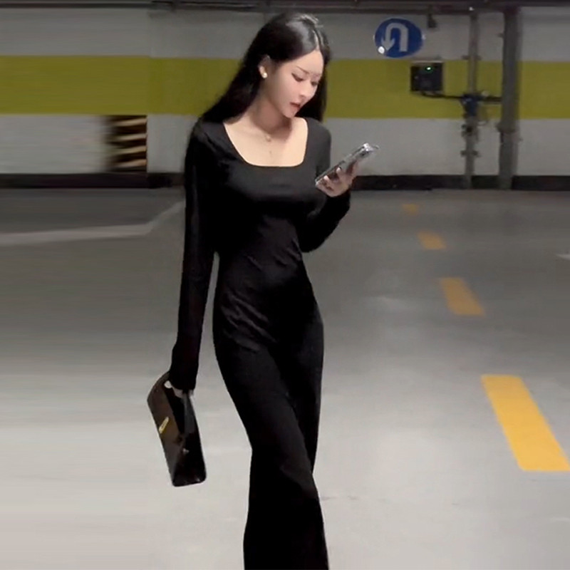 Черный лонгслив, весеннее платье, длинная юбка, французский стиль, квадратный вырез, 2024 года, с акцентом на бедрах