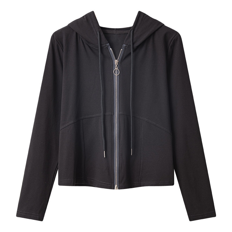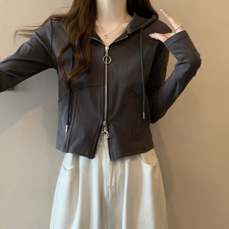 Осенний дизайнерский короткий лонгслив с капюшоном с молнией, большой размер, подходит для полных девушек, тренд сезона, облегающий крой