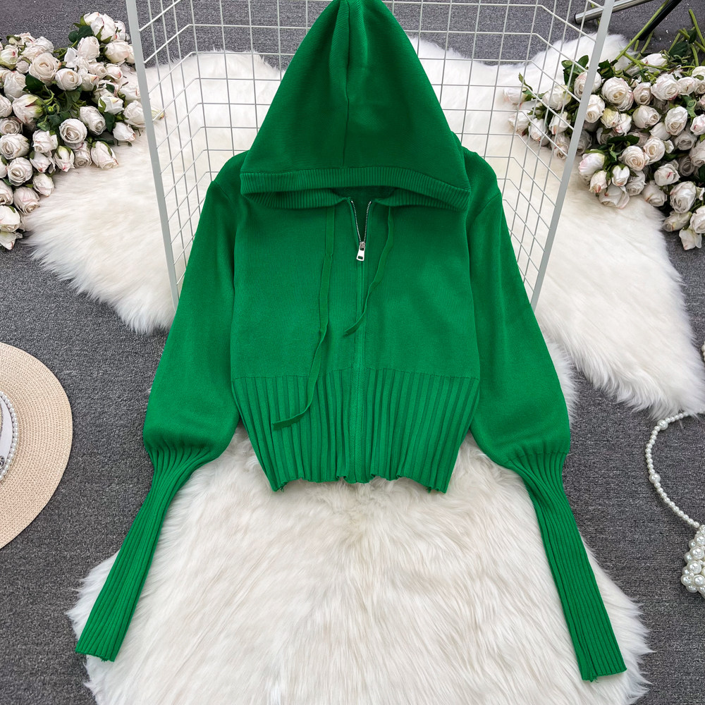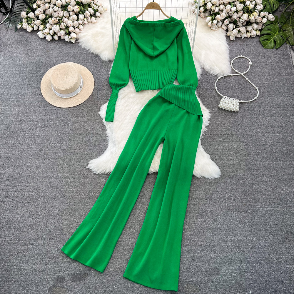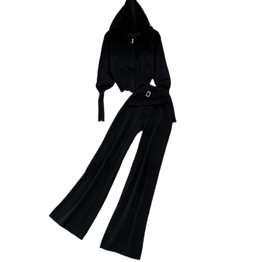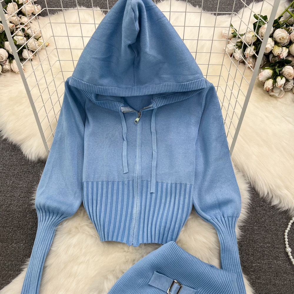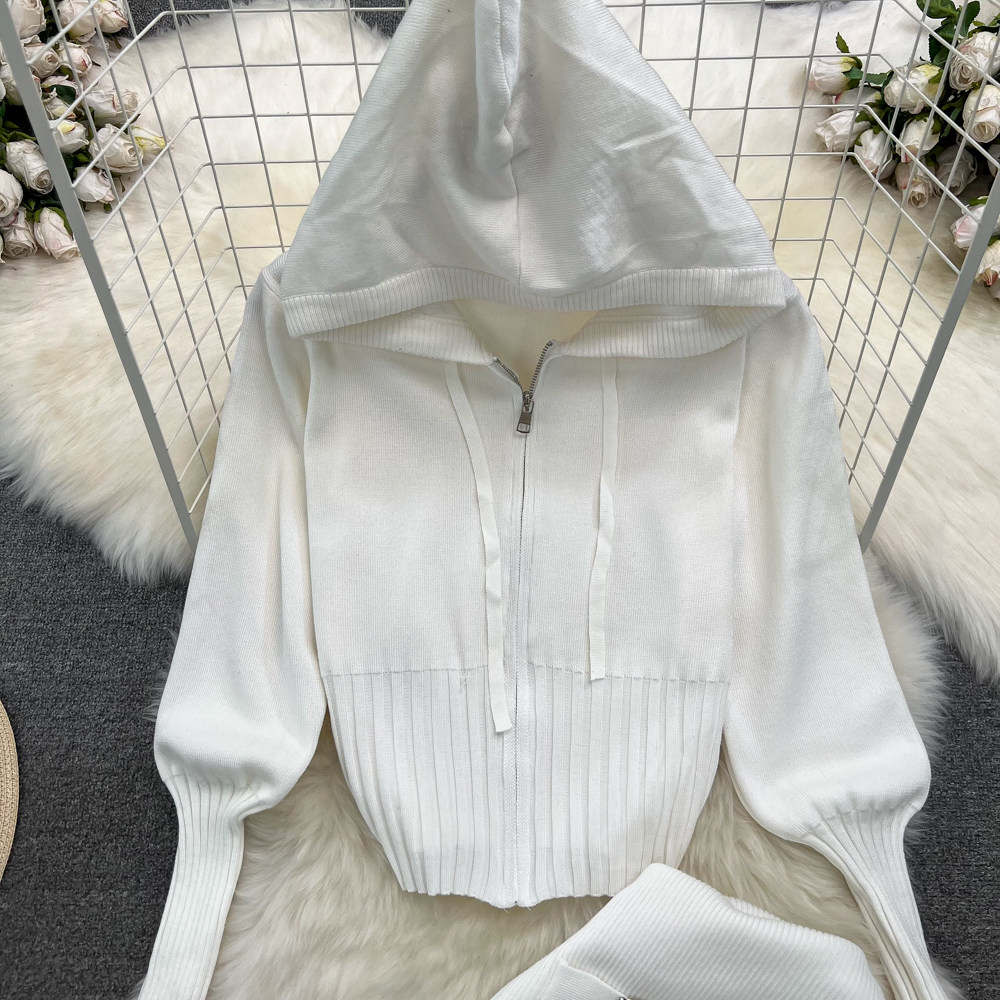 Комплект, лонгслив с молнией, трикотажное трикотажное платье, толстовка с капюшоном, приталенные штаны, в корейском стиле, высокая талия