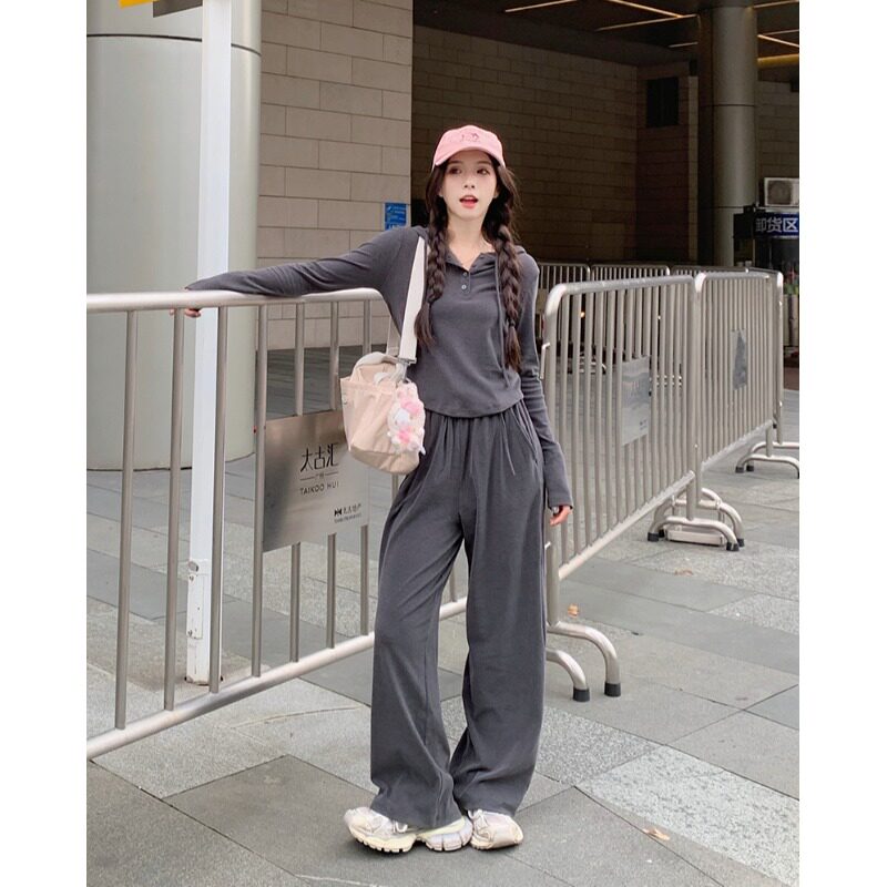 Весенний универсальный комплект, лонгслив с капюшоном, приталенные штаны, большой размер, воротник поло, высокая талия