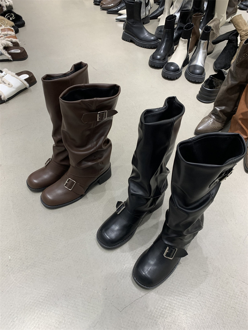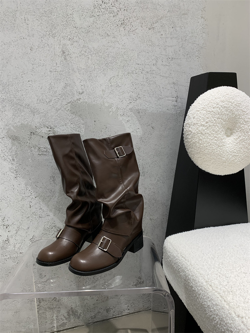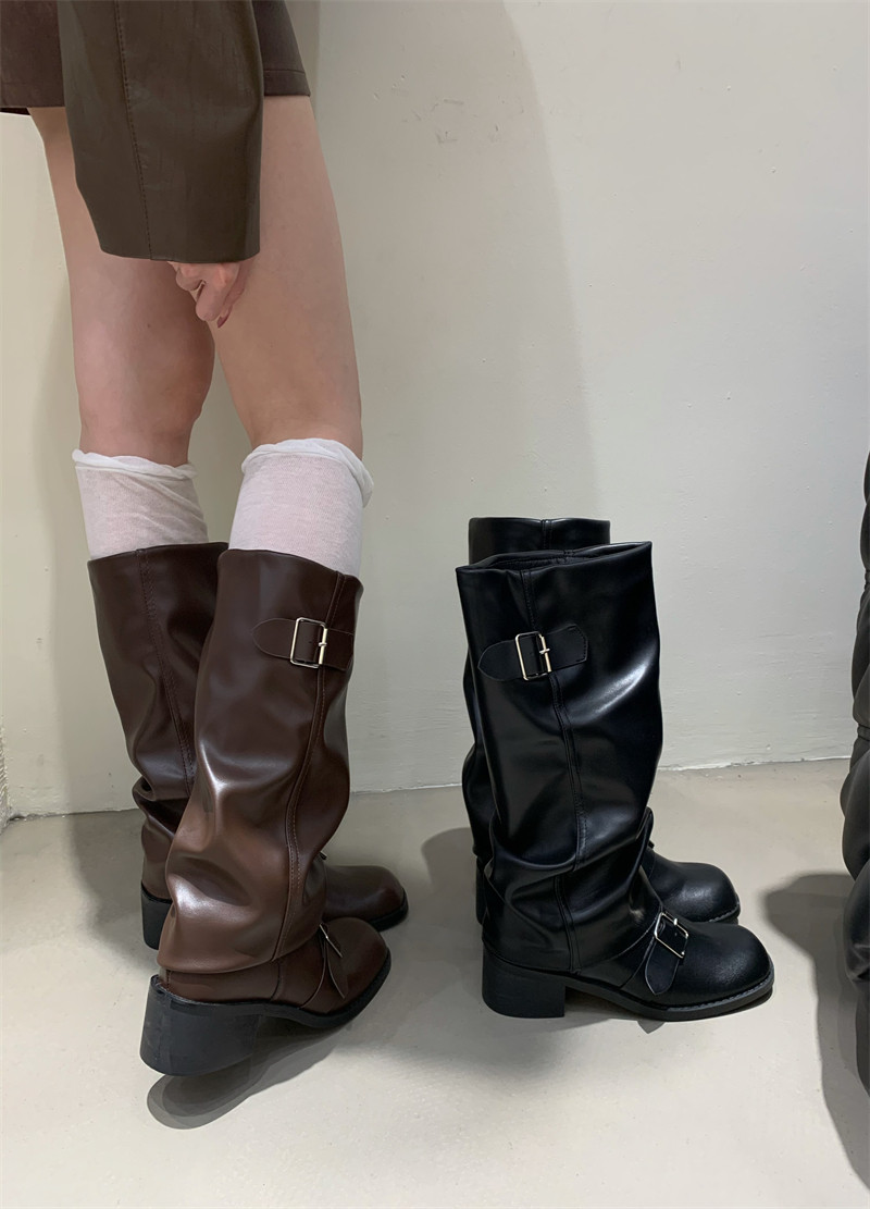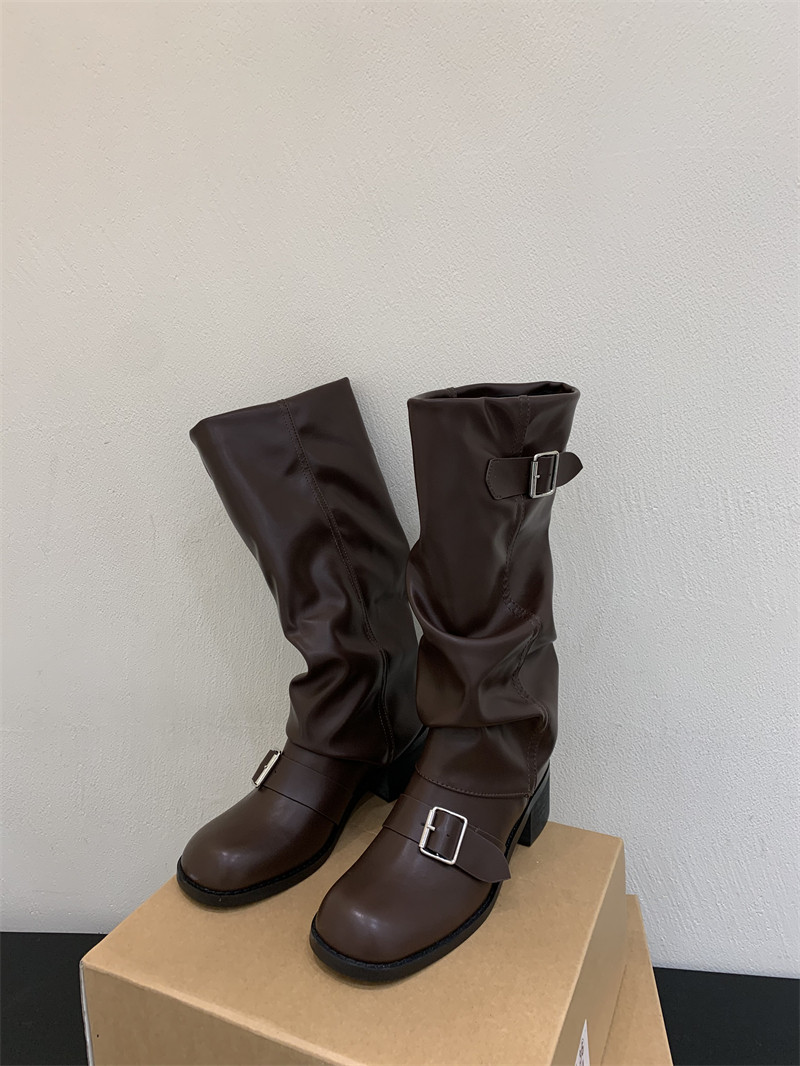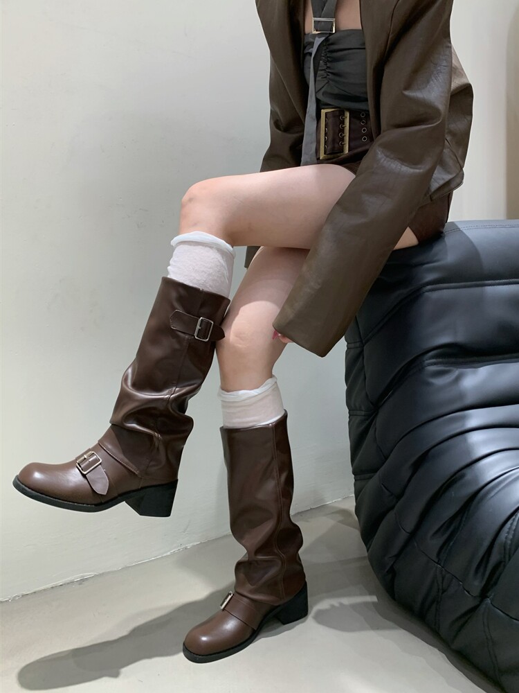 Коричневые эластичные ботинки, высокие сапоги, ремень, пряжка