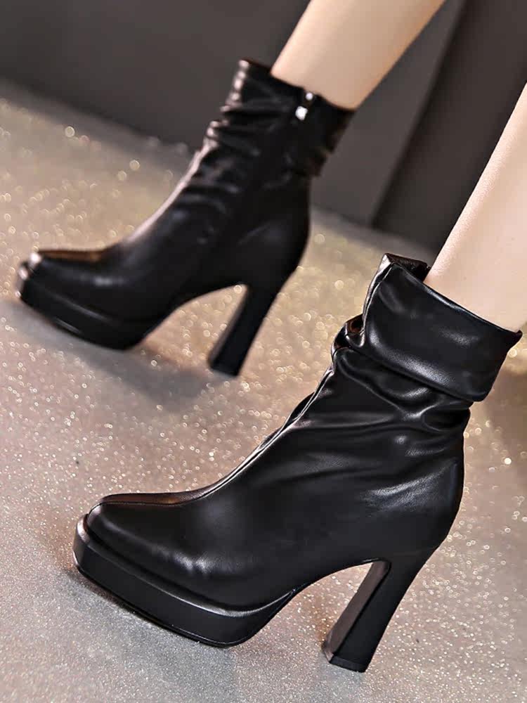 Черные короткие сапоги, флисовые демисезонные туфли на высоком каблуке, коллекция 2023