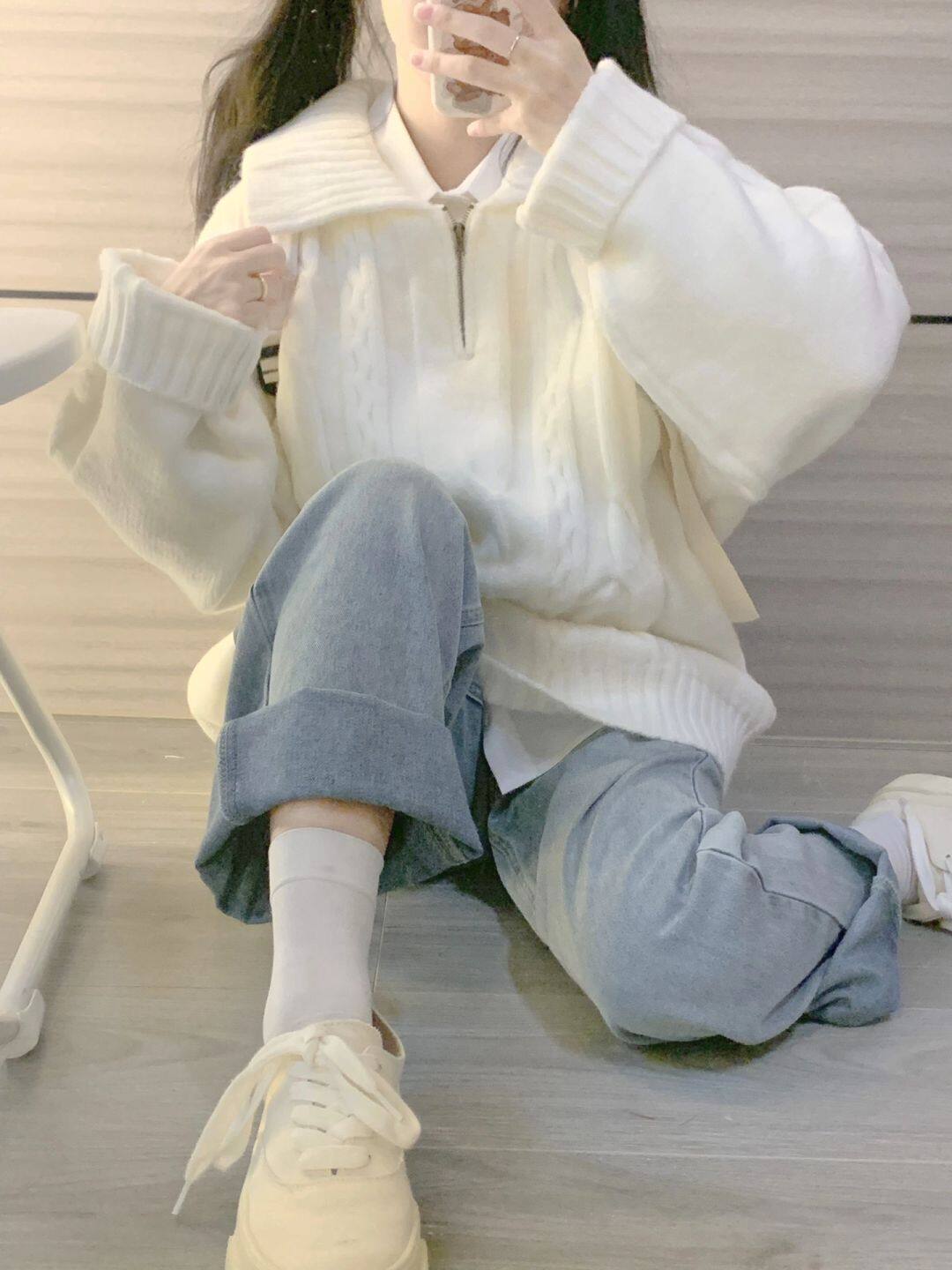 Белый осенний демисезонный свитер, небольшая японская ретро куртка, воротник поло, подходит для подростков