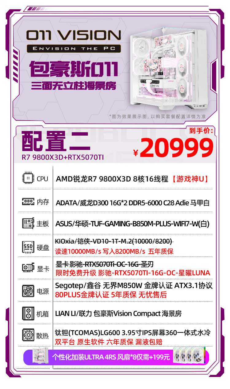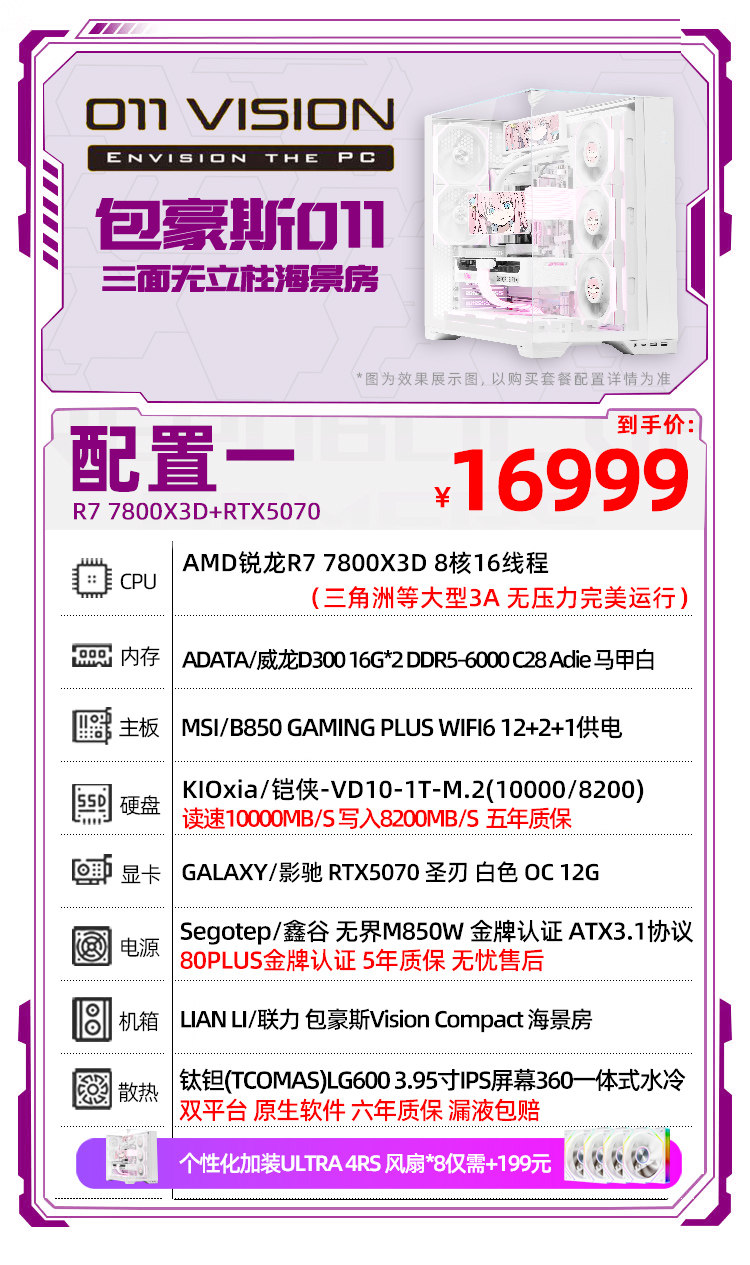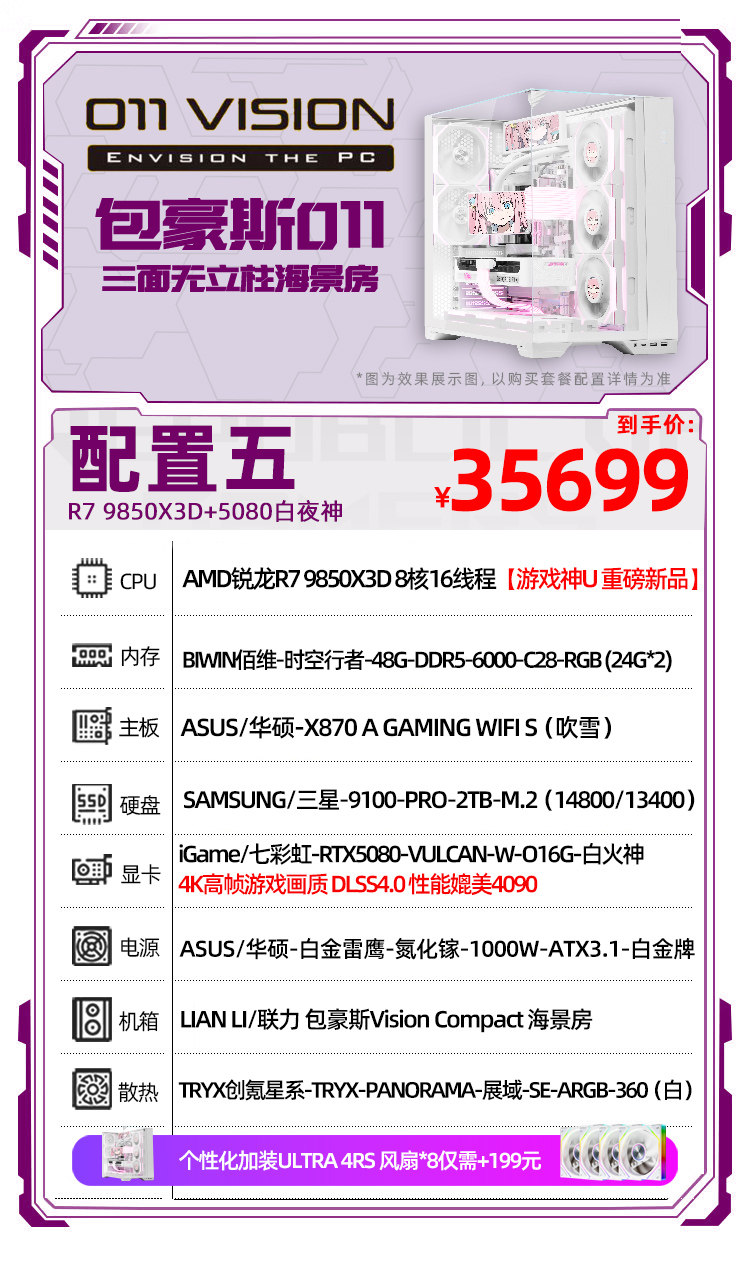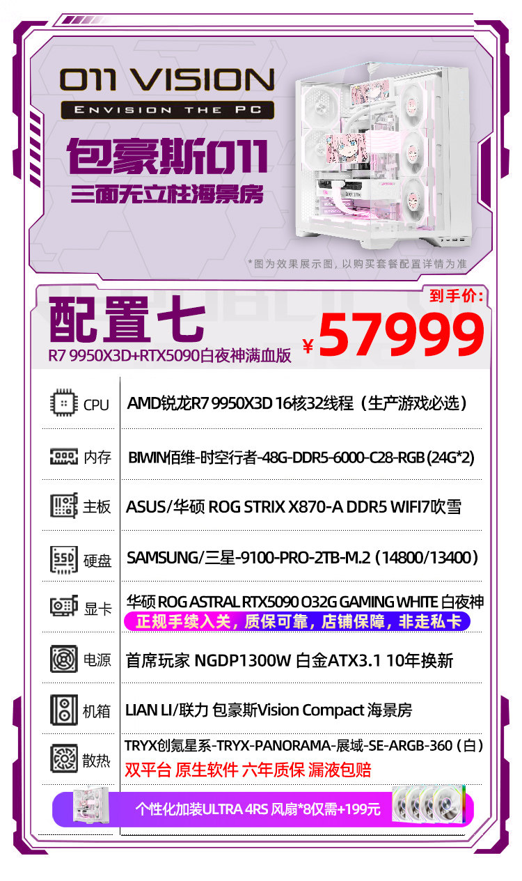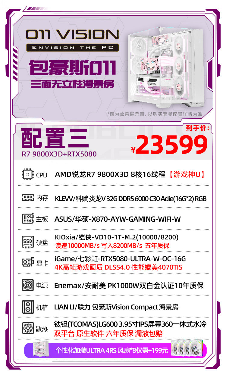 | Тип упаковки: | R7 7800X3D+RTX5070丨1, R7 9800X3D+RTX5070Ti丨2, R7 9800X3D+RTX5080丨3, R7 9850X3D+5080 Белый Вулкан丨4, R9 9850X3D+5080 Белый Вулкан丨5, R7 9850X3D+5090D丨6, R9 9950X3D+5090 полнокровная версия 丨7 |