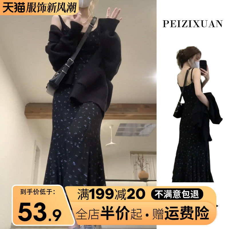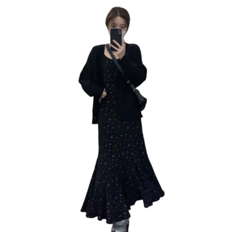 Черное осеннее платье, приталенный корсет, длинная юбка, французский стиль, изысканный стиль, цветочный принт, коллекция 2023, крой «рыбий хвост»