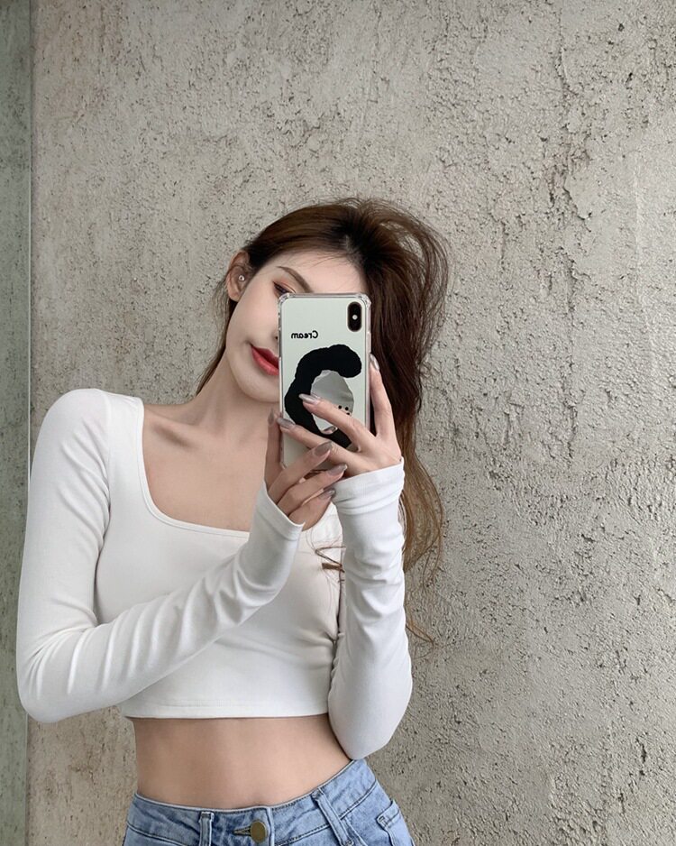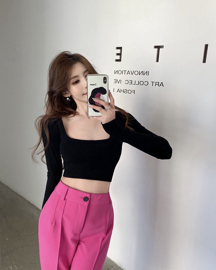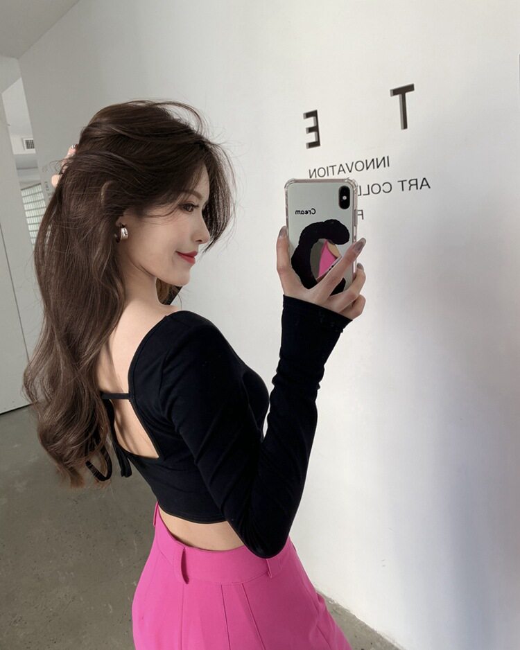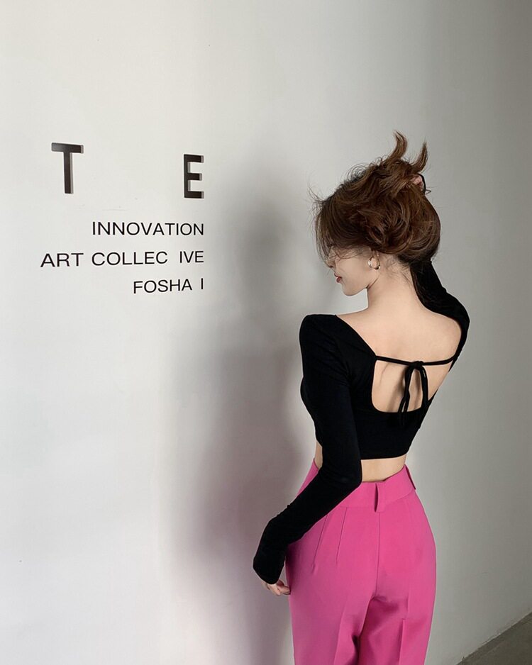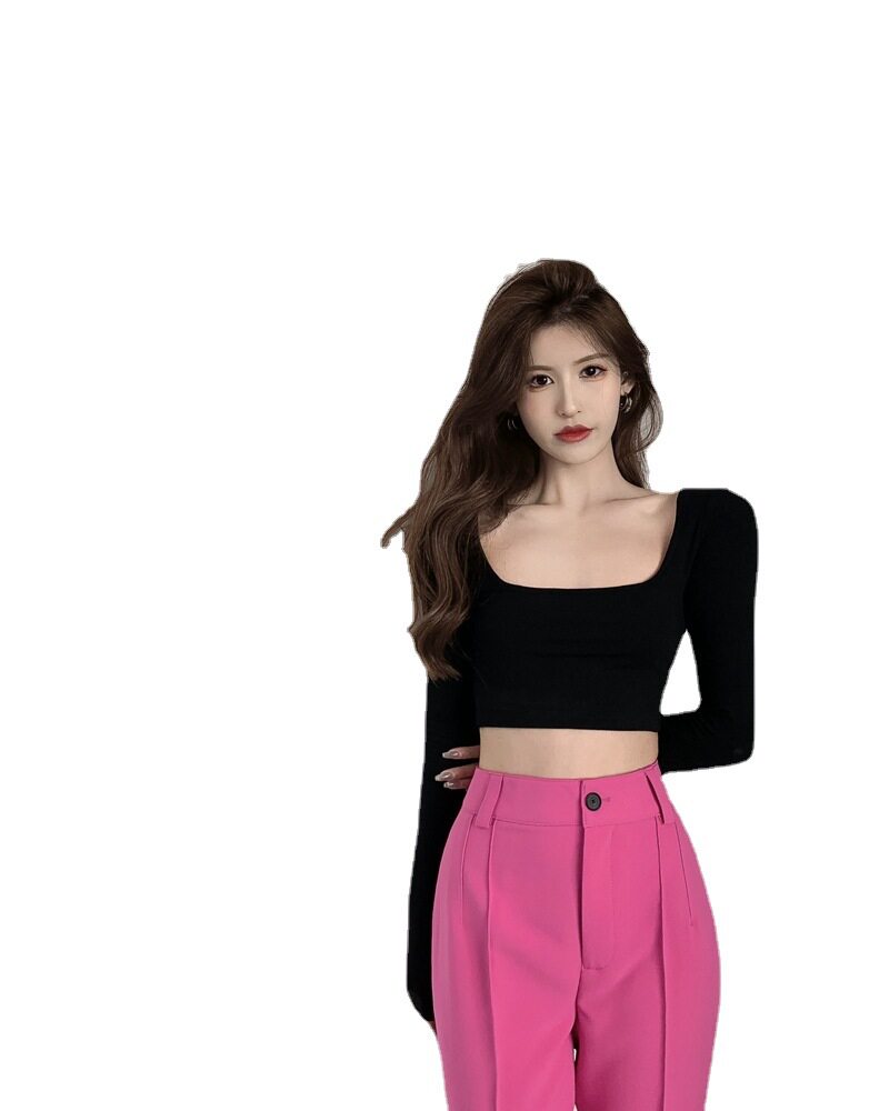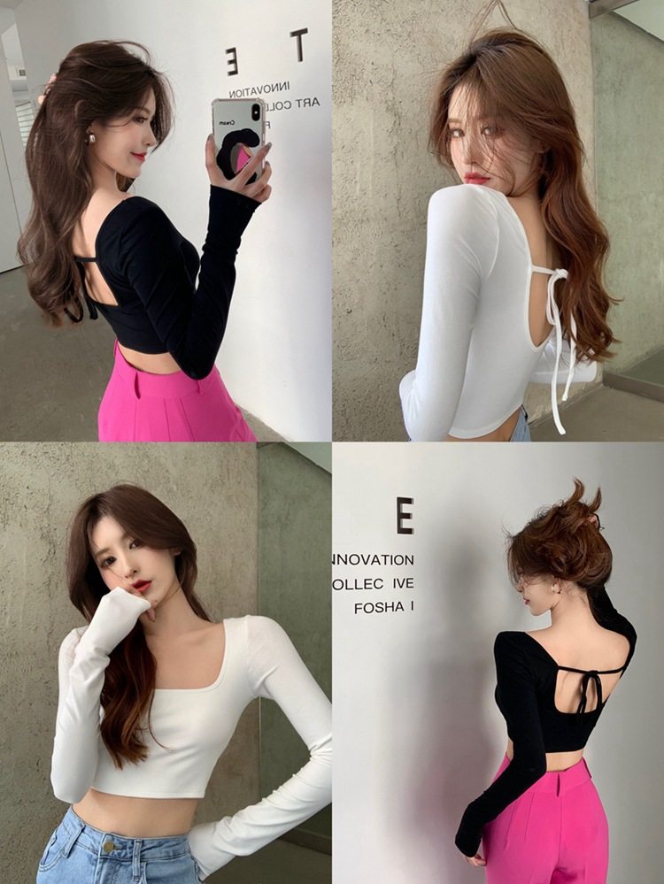 Осенняя футболка, короткий базовый приятный телу лонгслив, в американском стиле, с открытой спиной, квадратный вырез