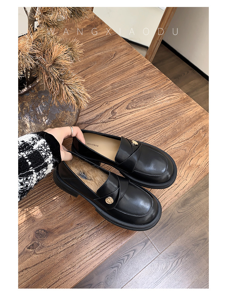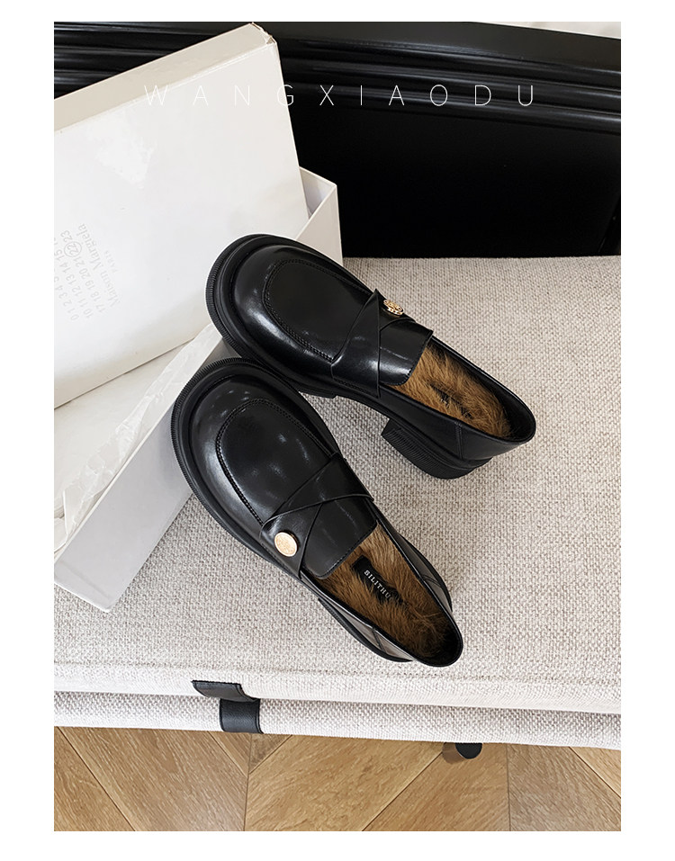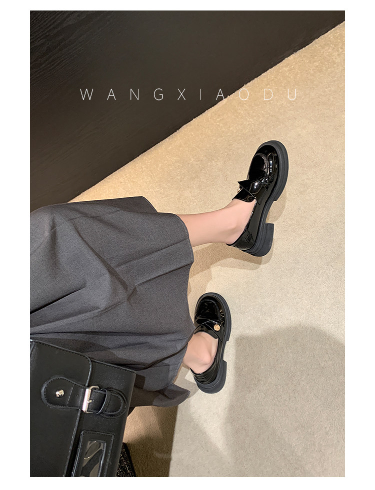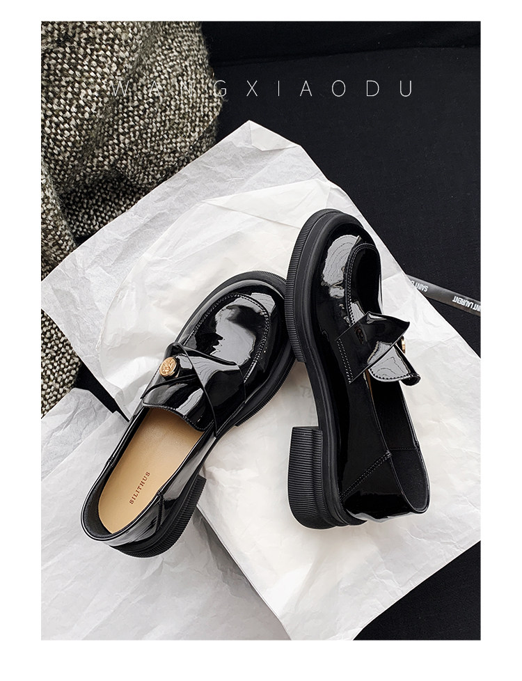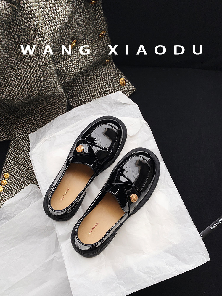 [Ван Сяоду] Сегодняшние восемь стилей: черные женские маленькие кожаные туфли с круглым носком, новые британские лоферы из лакированной кожи на толстом каблуке