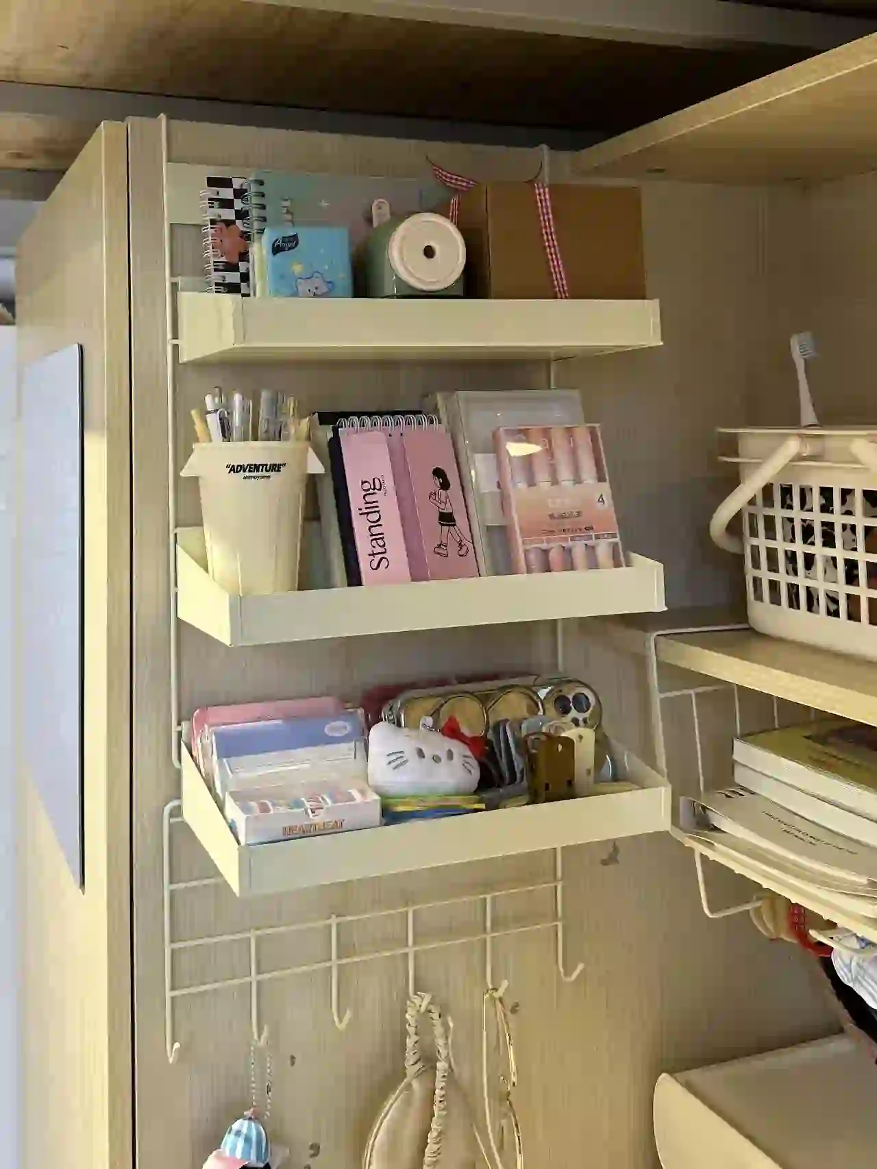 Студент колледжа колледжа для общежития, ставлю полки верхней части верхней полки и вне кровати Стена хранения