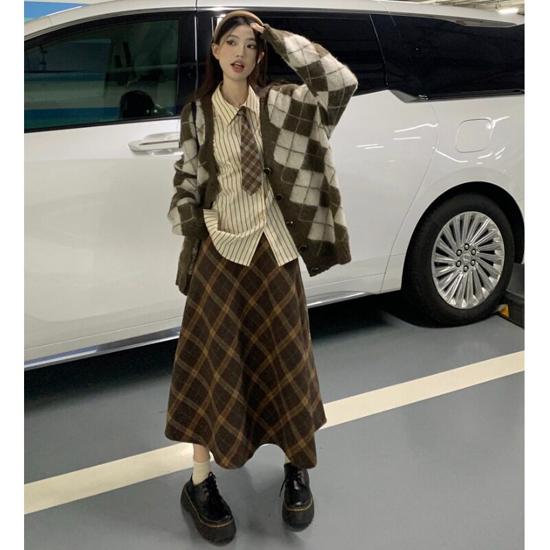 Весенняя клетчатая юбка, рубашка, галстук, кардиган, свитер, комплект, большой размер, высокая талия, воротник поло, 4 предмета