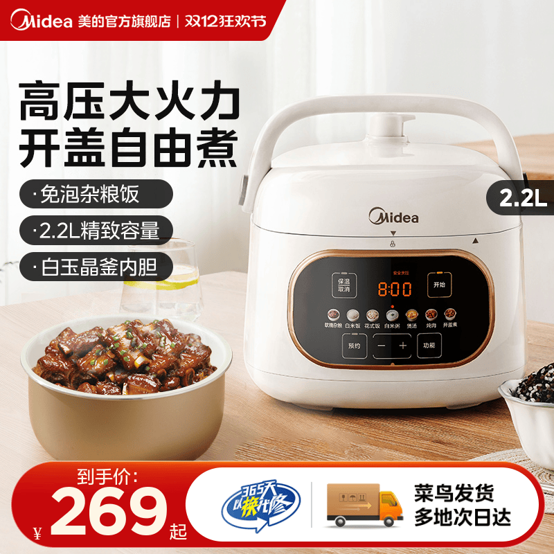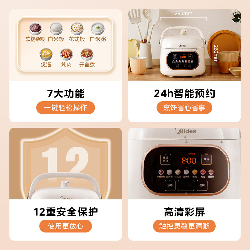 Электрическая скороварка Midea Домохозяйство Маленькая интеллектуальная полностью автоматическая мини -электрическая высокая высокая кишка для горшковой плиты 2.2L Маленькая мощность Новая модель новая модель