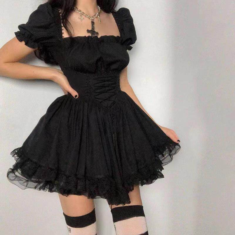 Лолита черное платье гот эстетическое рукав с высокой талией