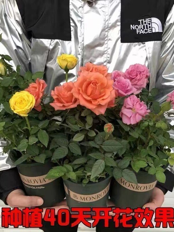 Розовые саженцы Four Seasons Four Seasons Цветочные балкон -сад вид с горшками и зелеными растениями