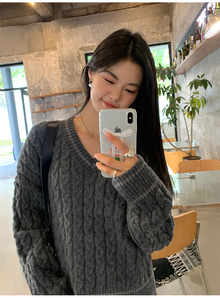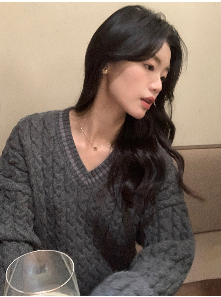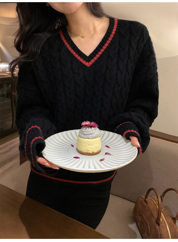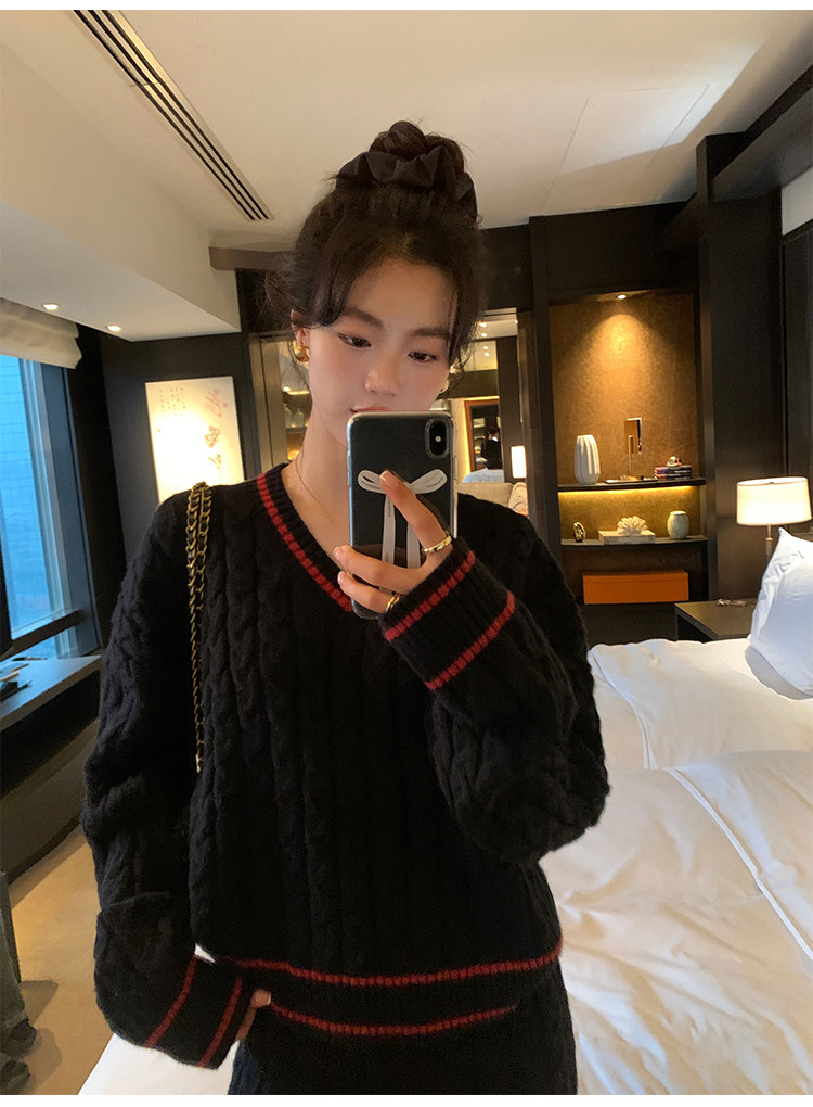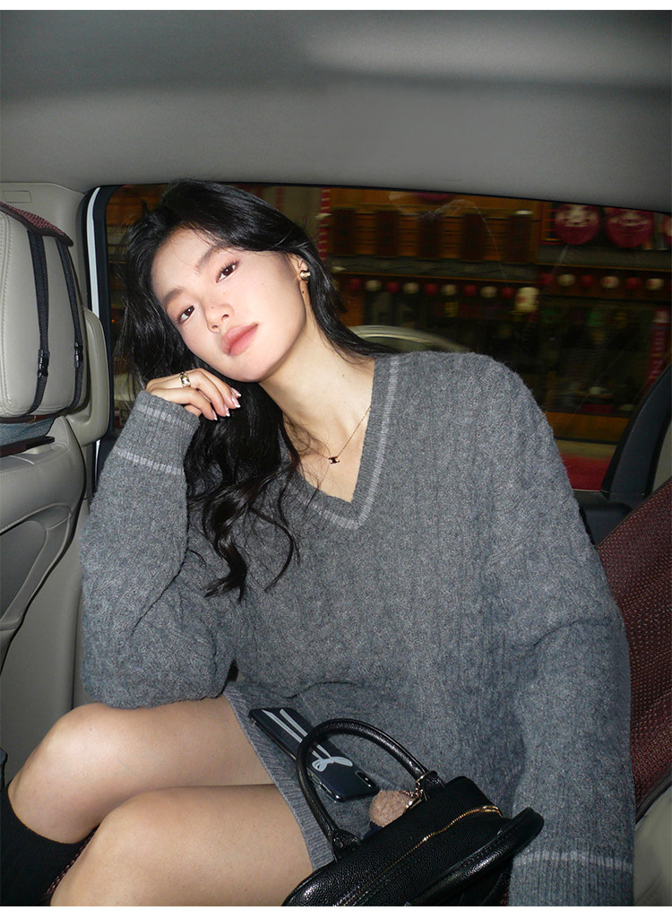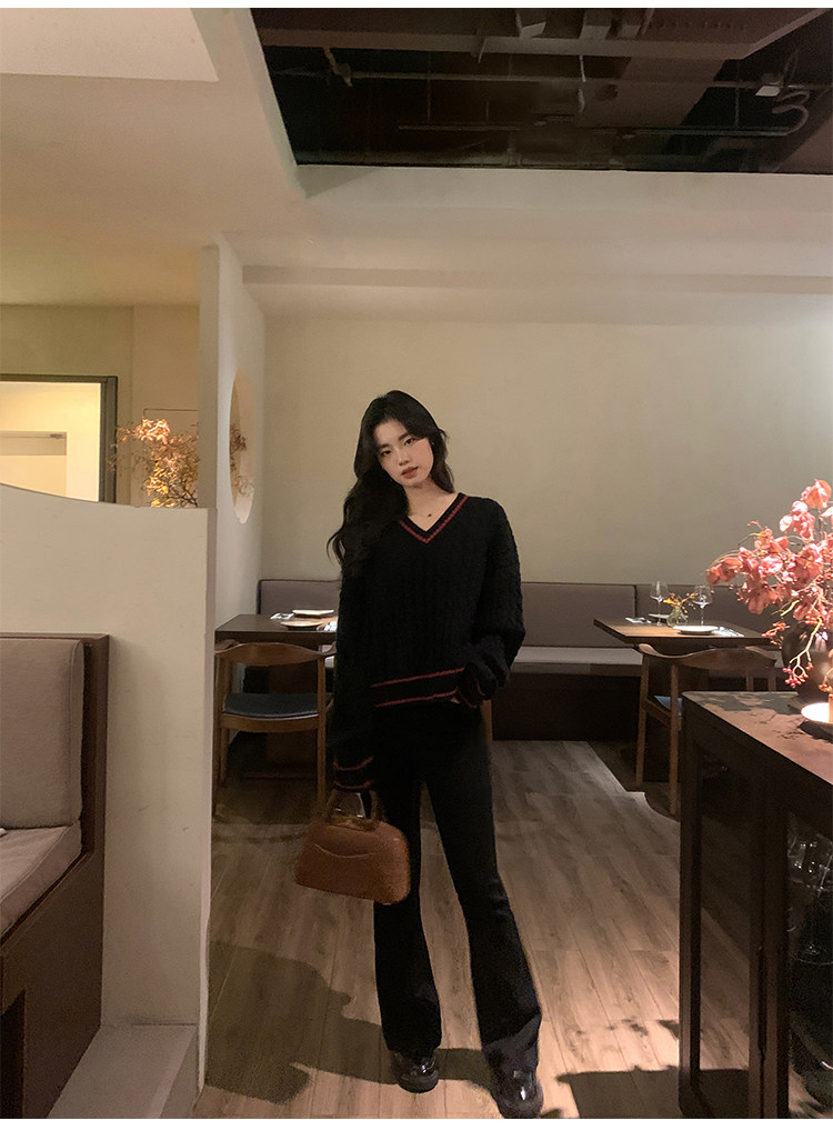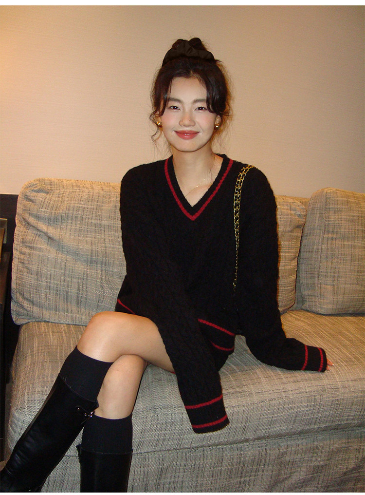 pusumede Черный зимний ретро трикотажный свитер, V-образный вырез, оверсайз