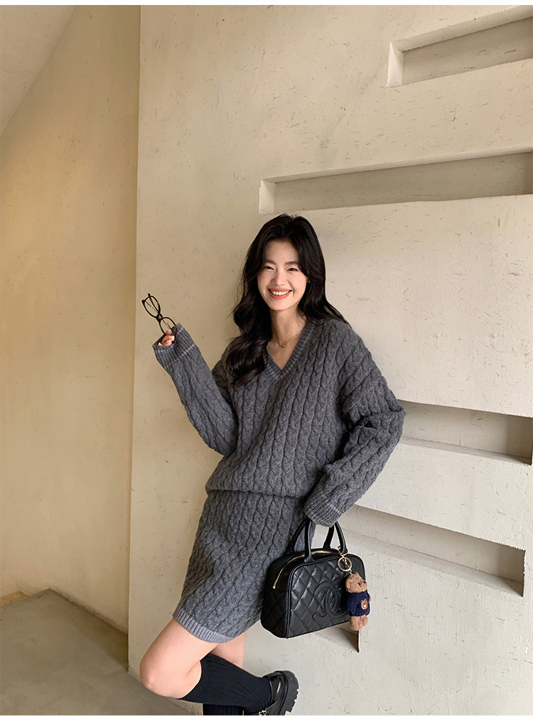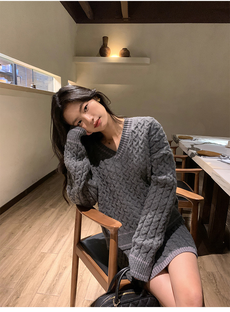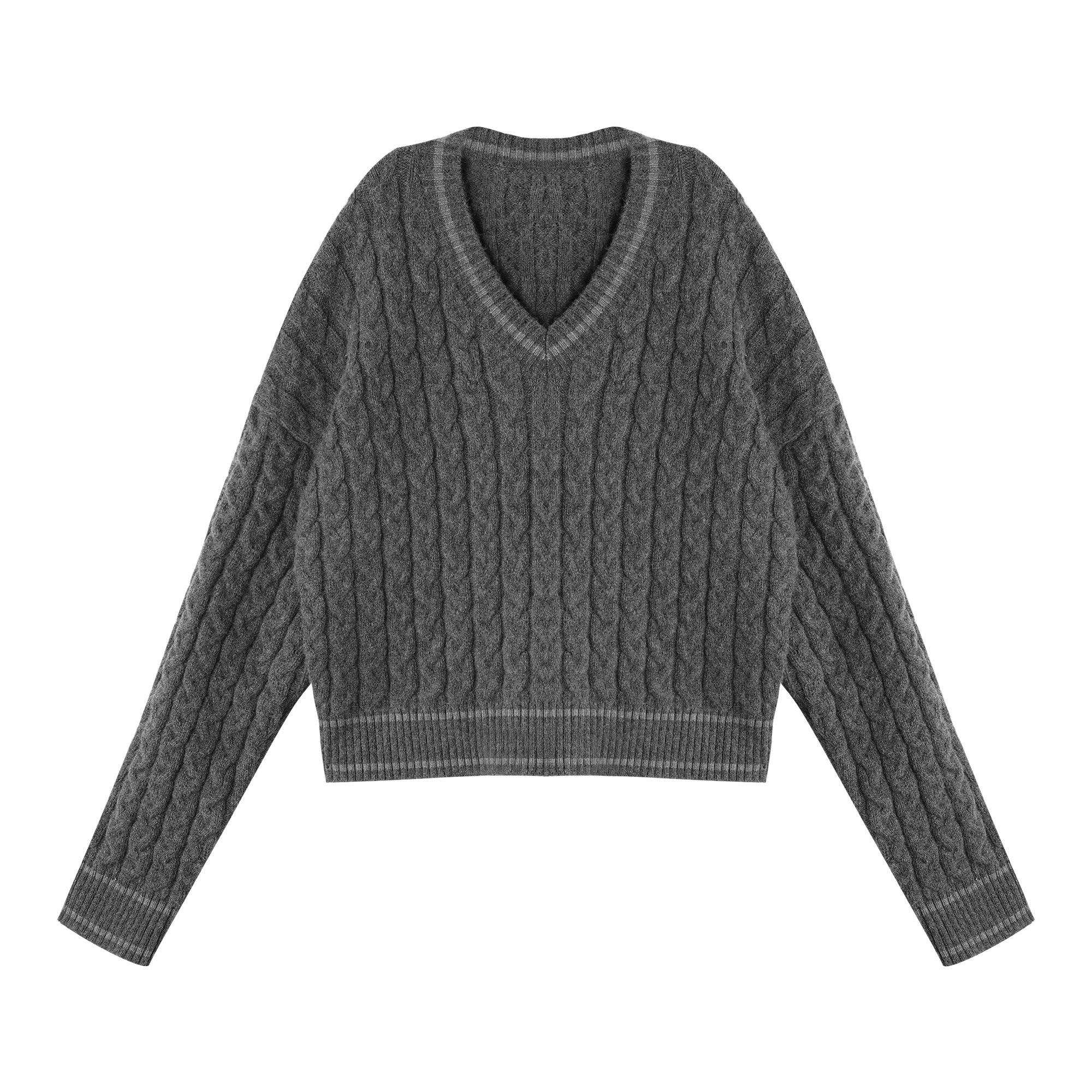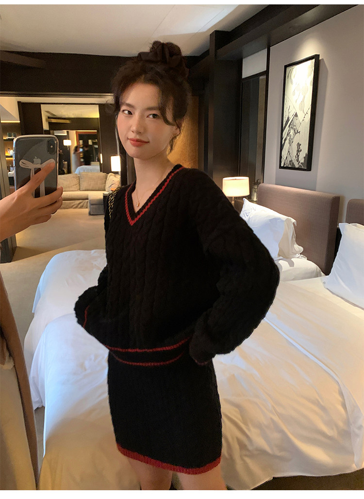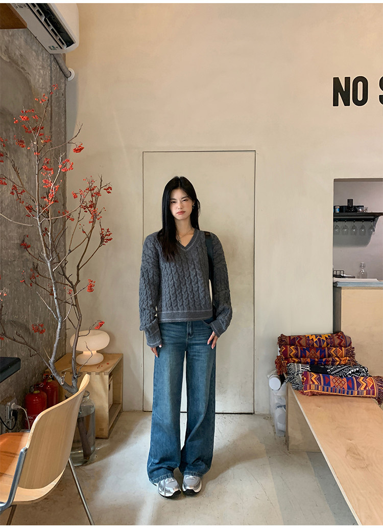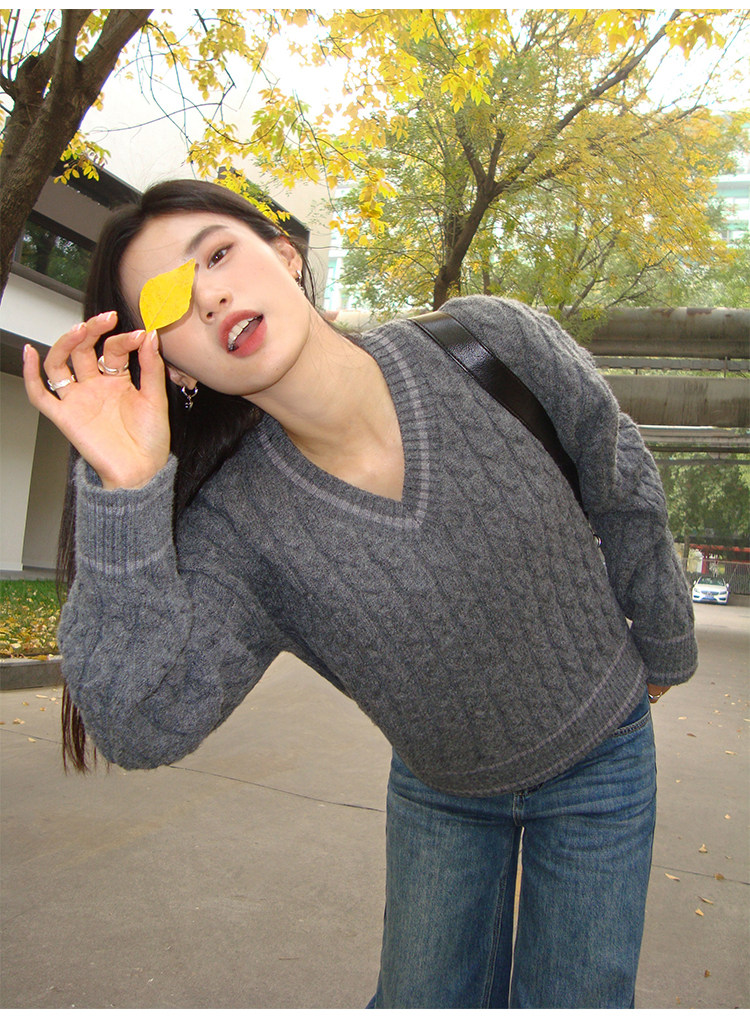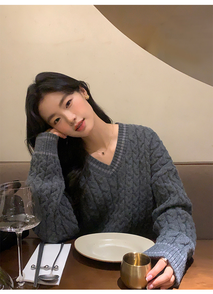 pusumede Черный зимний ретро трикотажный свитер, V-образный вырез, оверсайз