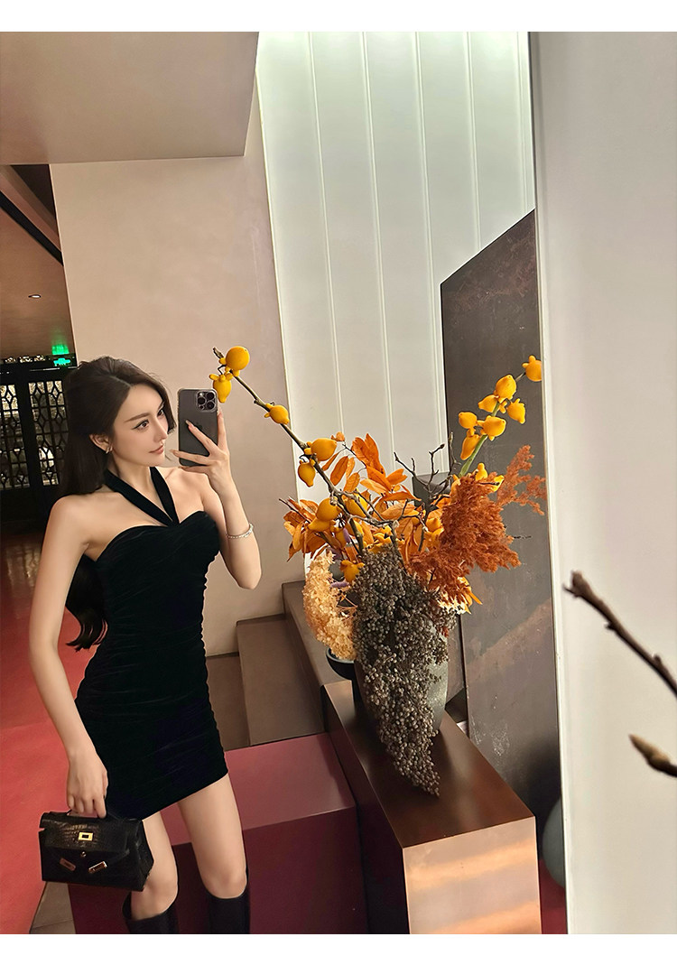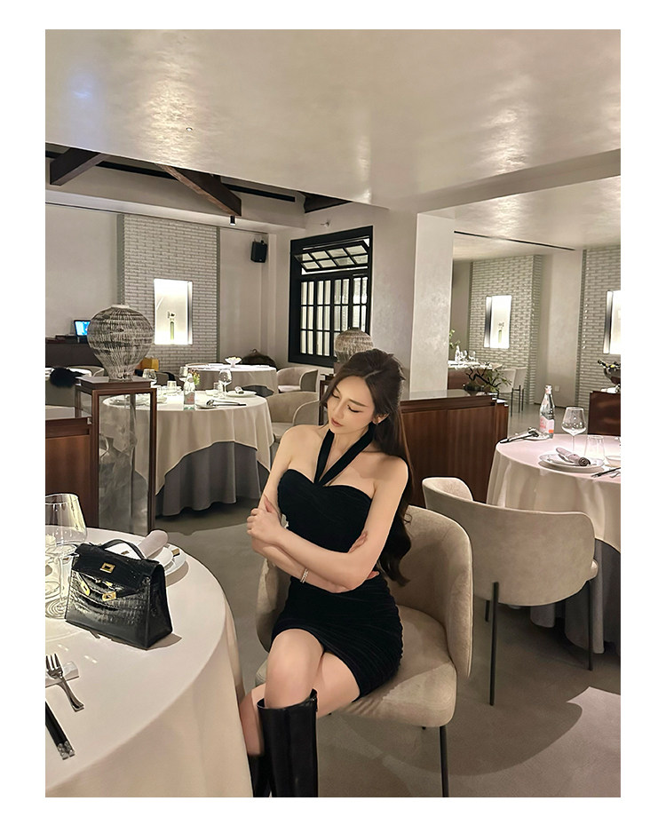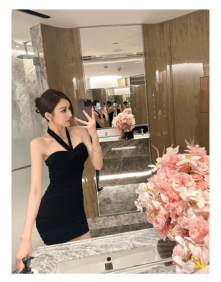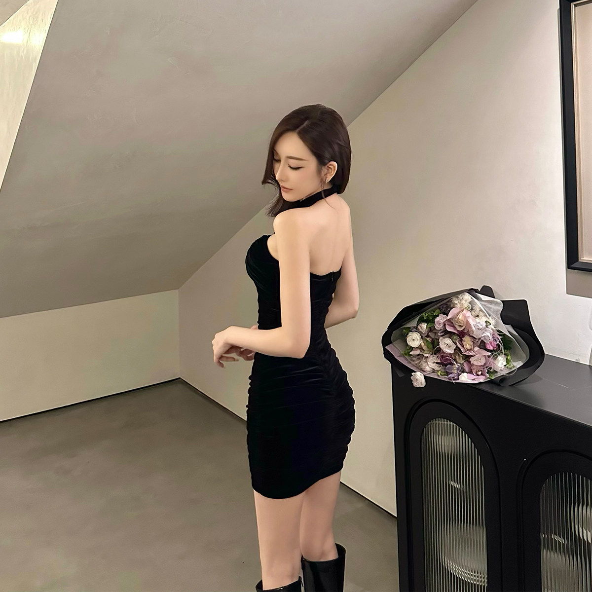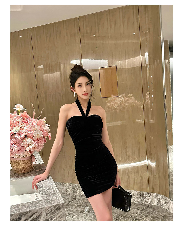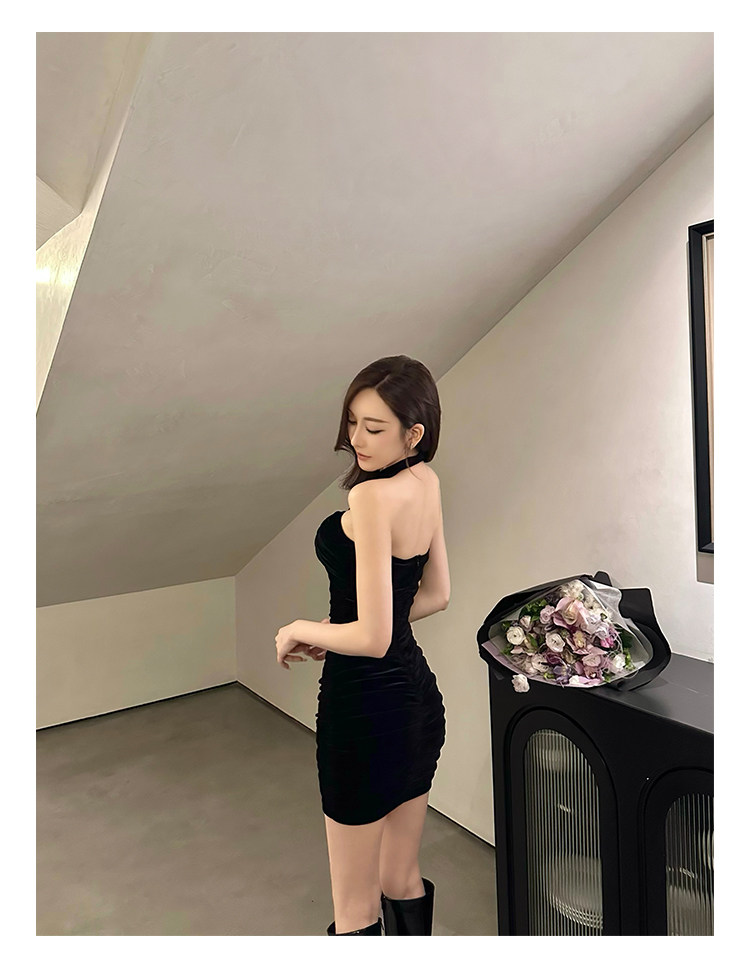 Бархатное платье, эластичный приталенный корсет, мини-юбка, с открытой спиной, с акцентом на бедрах
