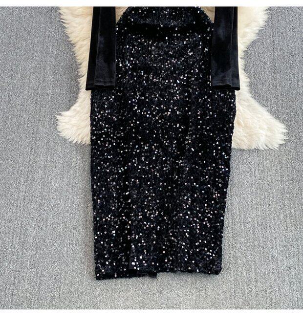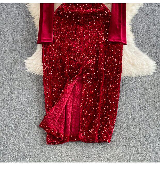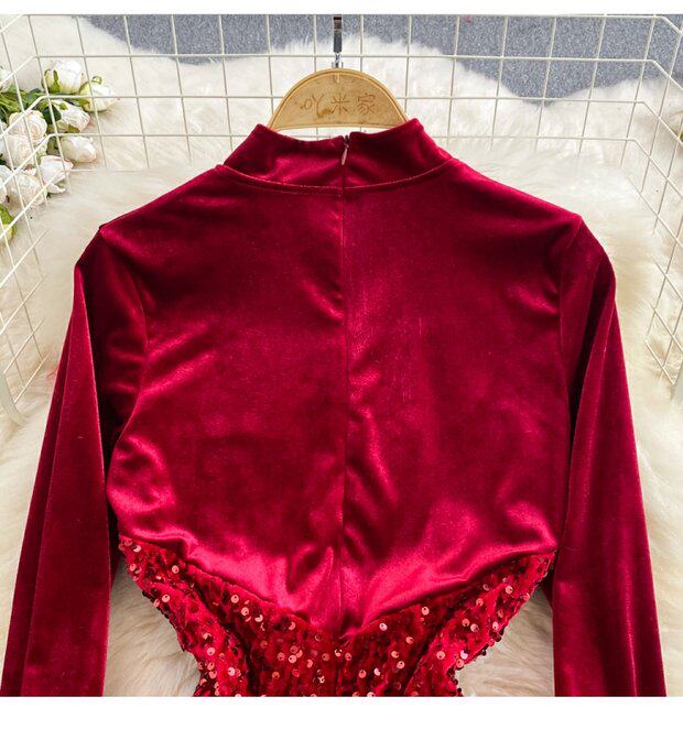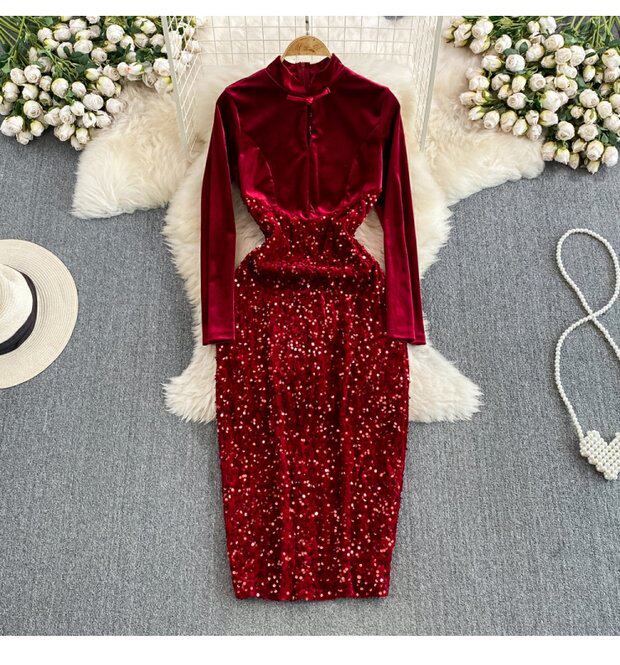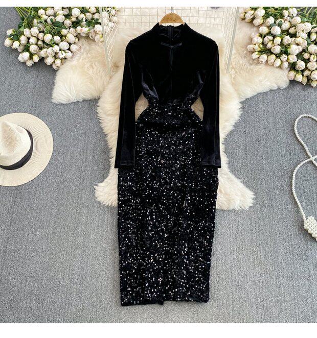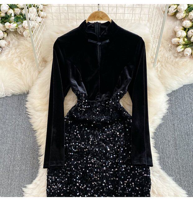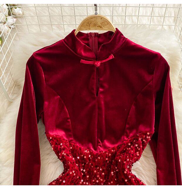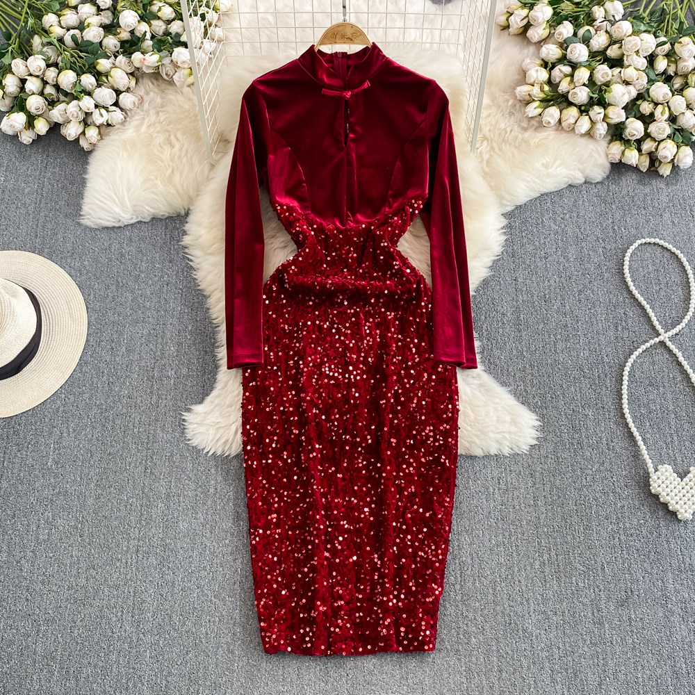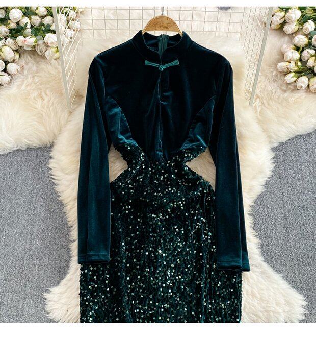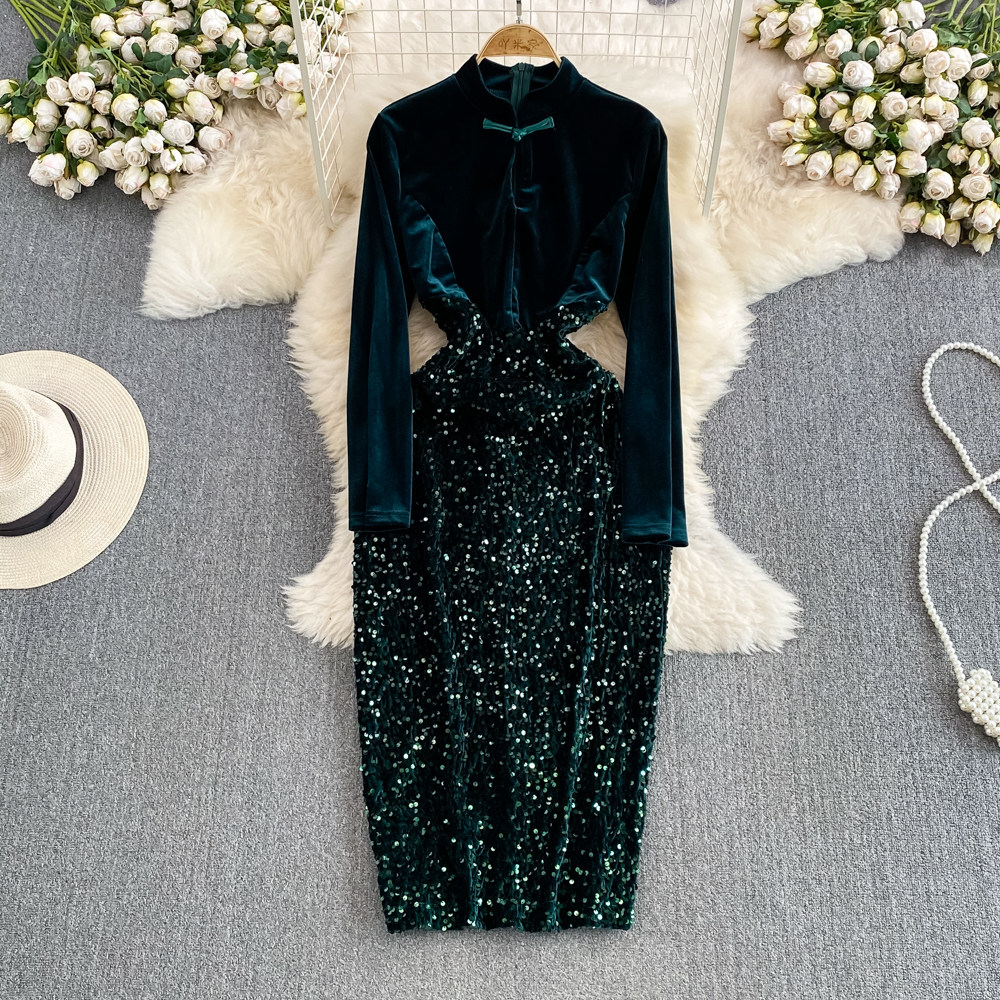 Бархатное платье, ретро длинная юбка, ципао, китайский стиль, с акцентом на бедрах