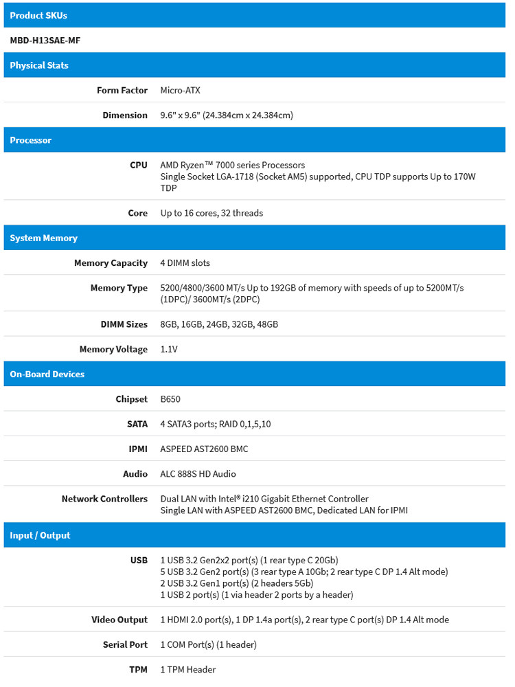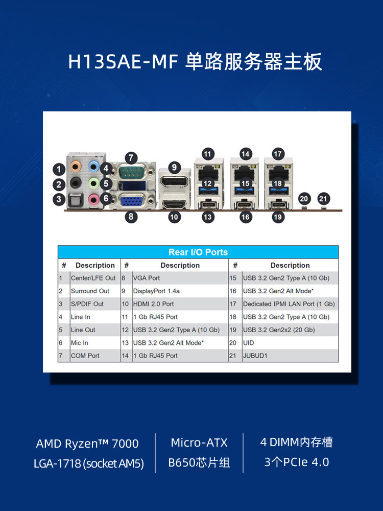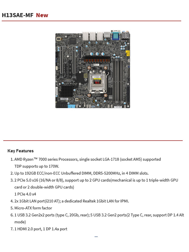 超微 Одноканальная материнская плата H13SAE-MF с чипом B650 поддерживает AMD Ryzen серии 7000 Micro-ATX