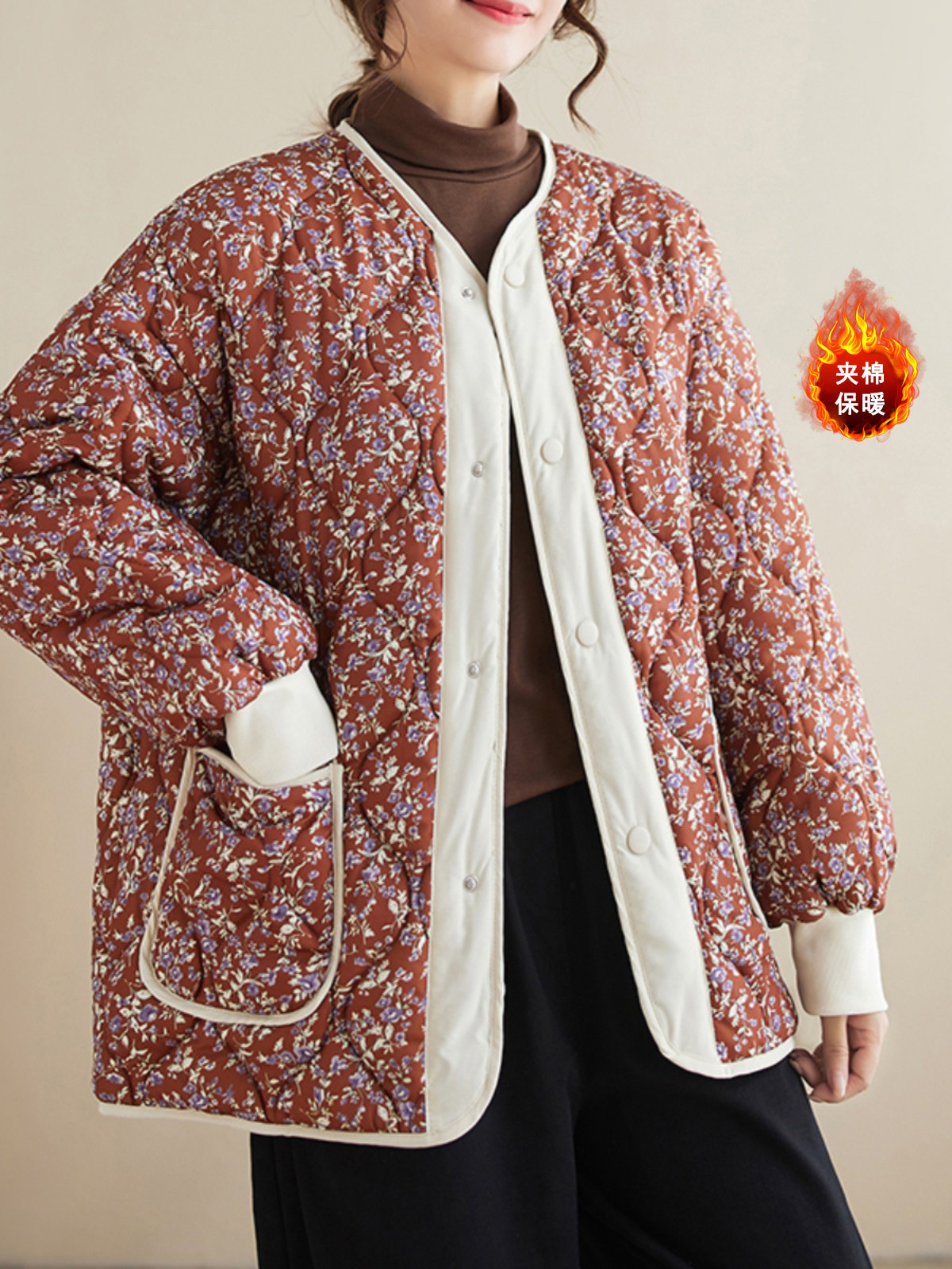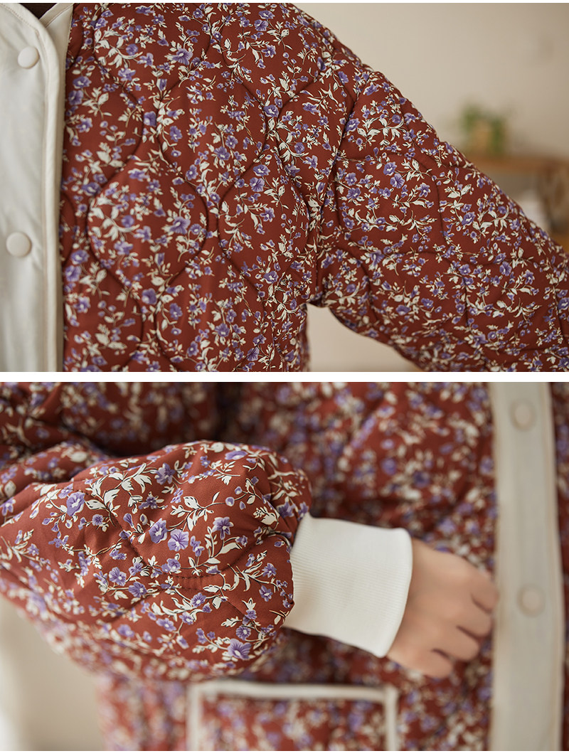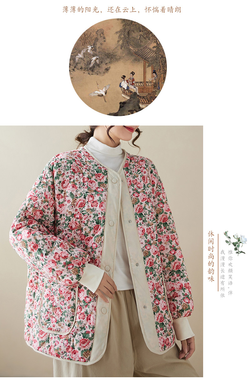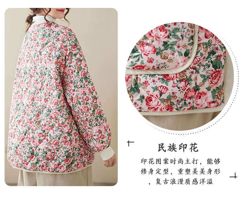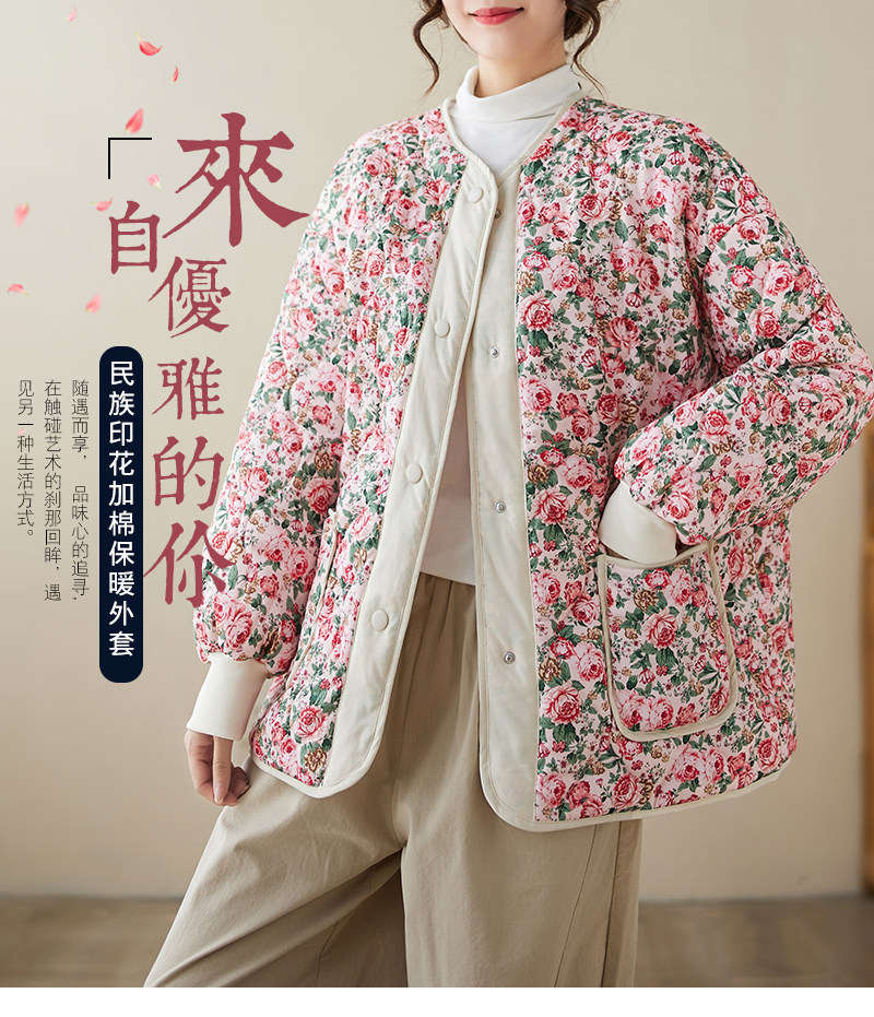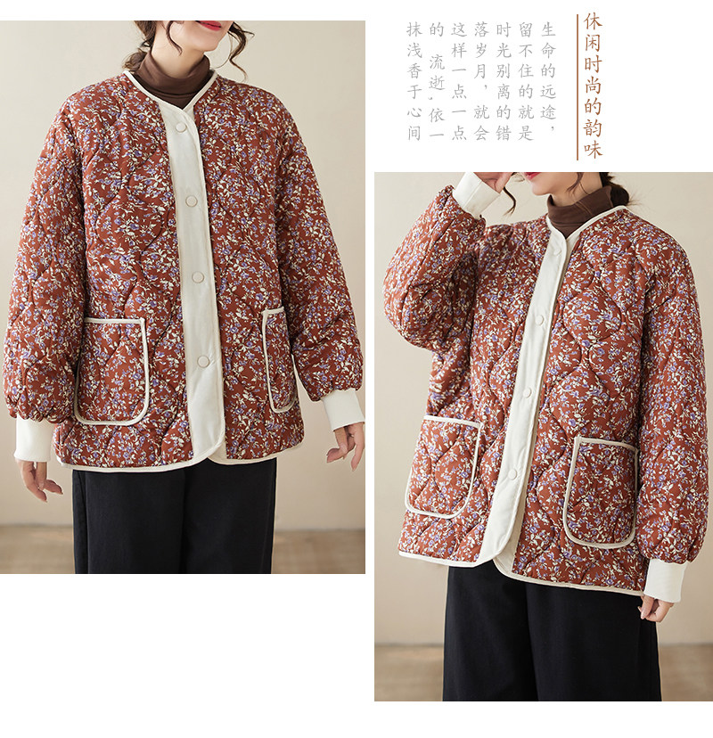 Ретро стеганая удерживающая тепло куртка с круглым воротником, лонгслив, пуховик, цветочный принт, большой размер