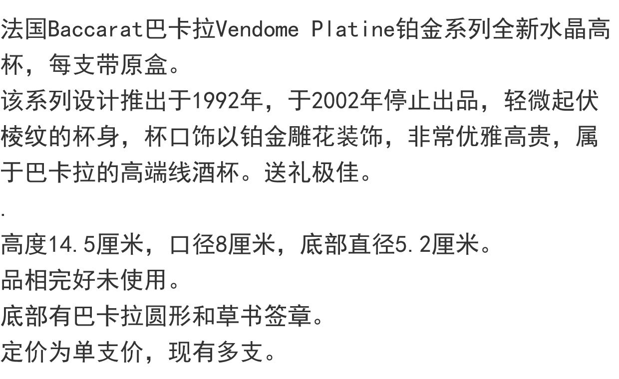 Новая коробка Baccarat/Bakara Vendome Platine Platinum Series Crystal High Cup