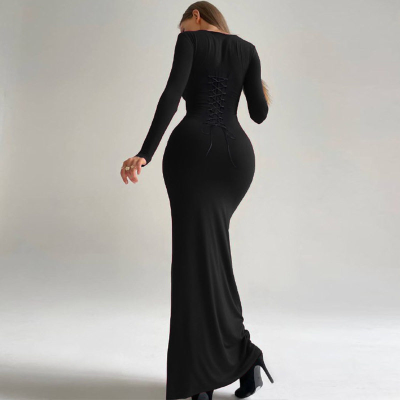 Модный ремень, черное платье, классический приталенный лонгслив, корсет, длинная юбка, европейский стиль, с акцентом на бедрах