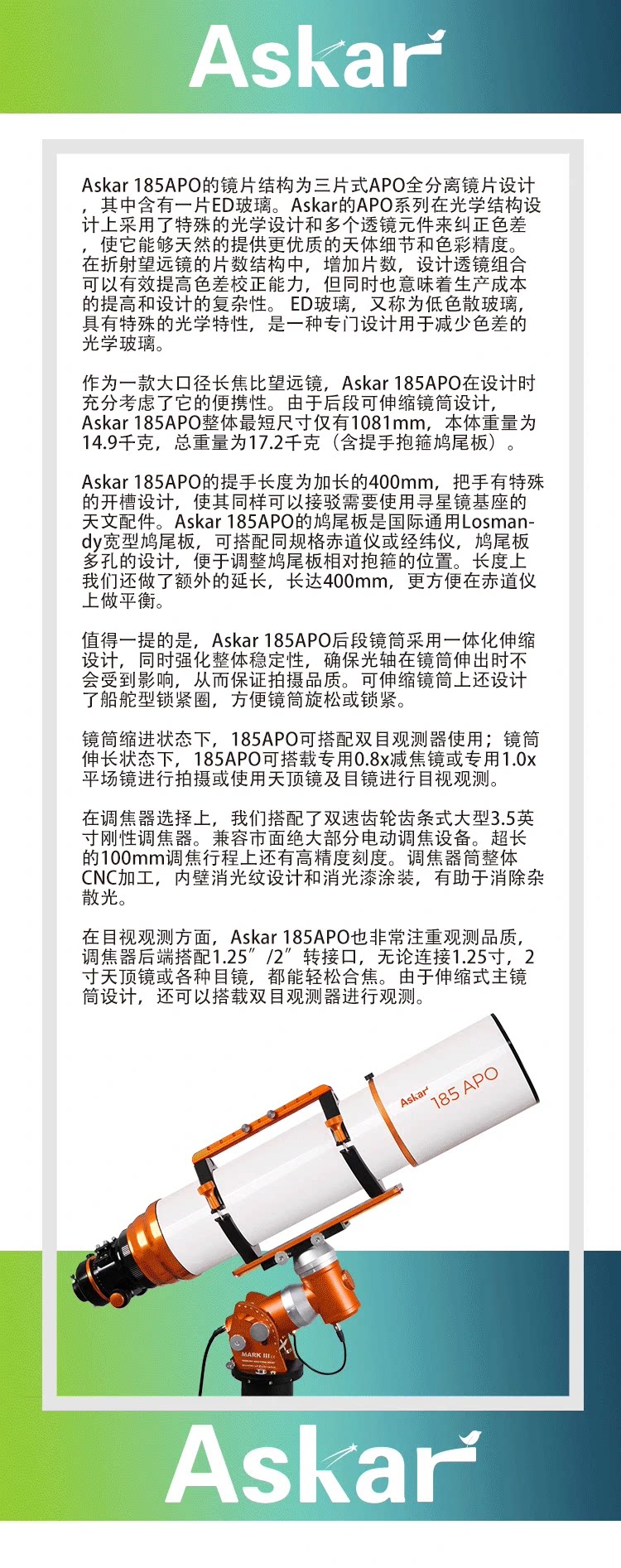 Астрономический телескоп Askar185Apo, специальный астрономический объектив, телескоп с большим диаметром для глубокого космоса