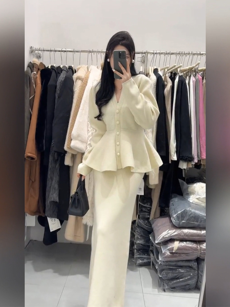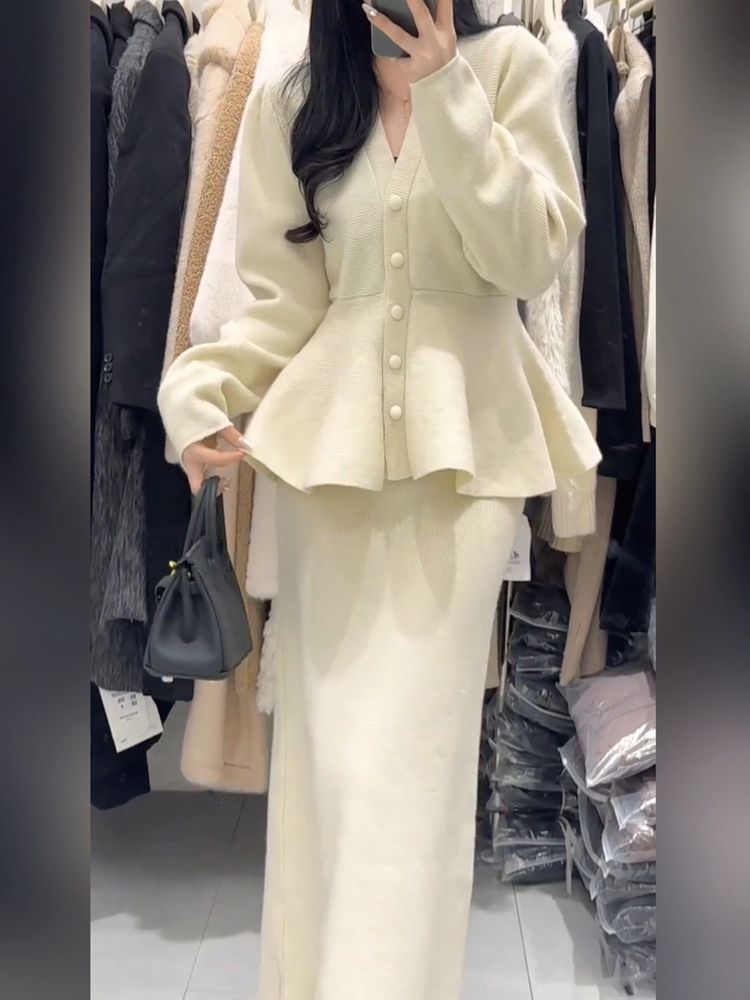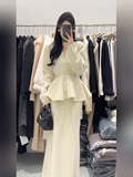 Дизайнерская трикотажная демисезонная юбка в складку, длинная юбка, комплект, большой размер, французский стиль, V-образный вырез, тренд сезона, высокая талия