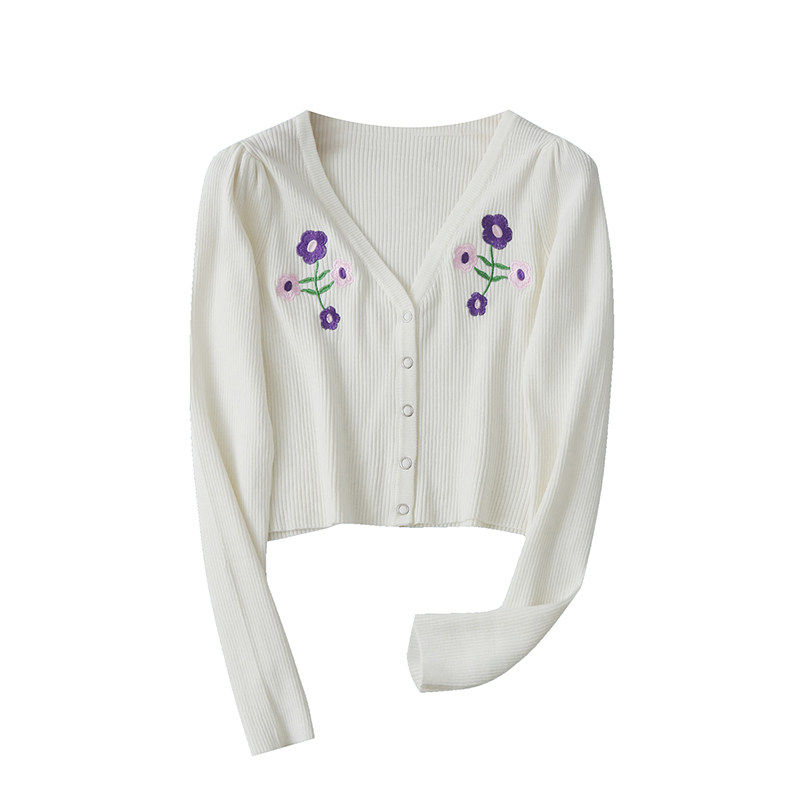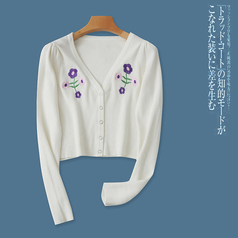 (Трансграничная торговля), трикотажный весенний короткий эластичный кардиган, с вышивкой, тренд сезона, V-образный вырез, облегающий крой