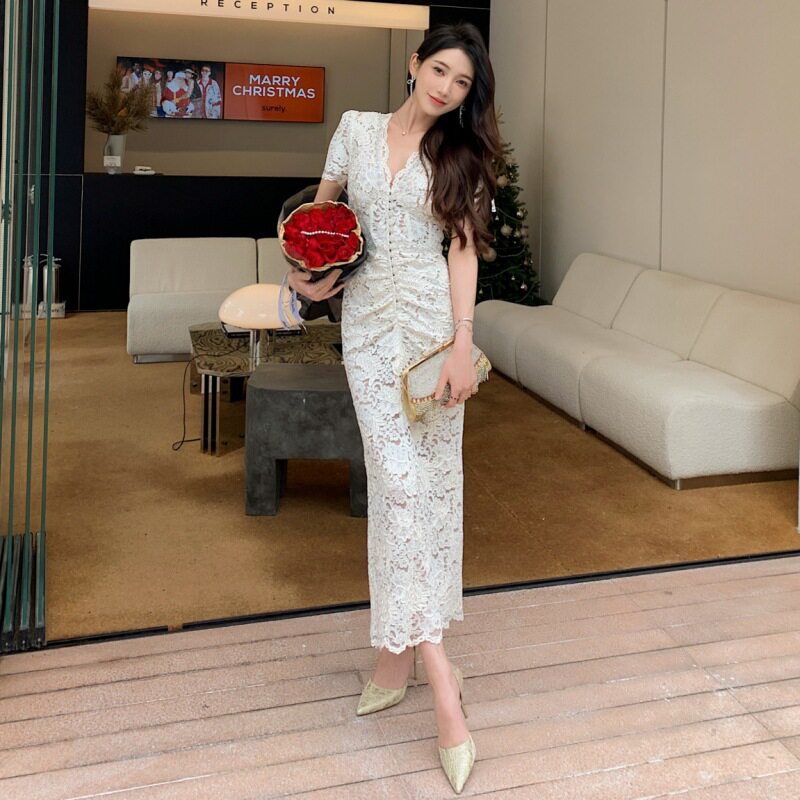 Качественная весенняя сексуальная кружевная длинная юбка, платье, V-образный вырез, короткий рукав, изысканный стиль