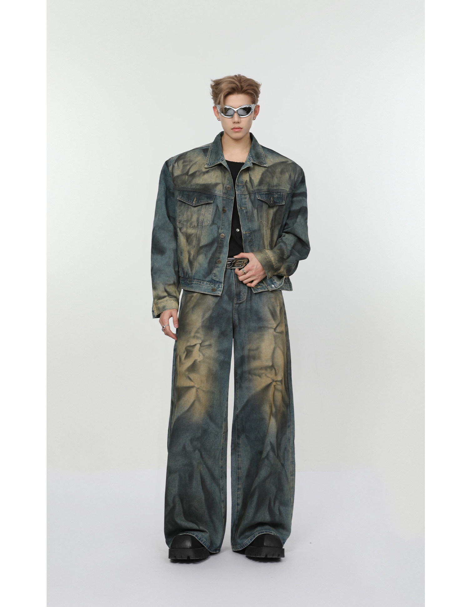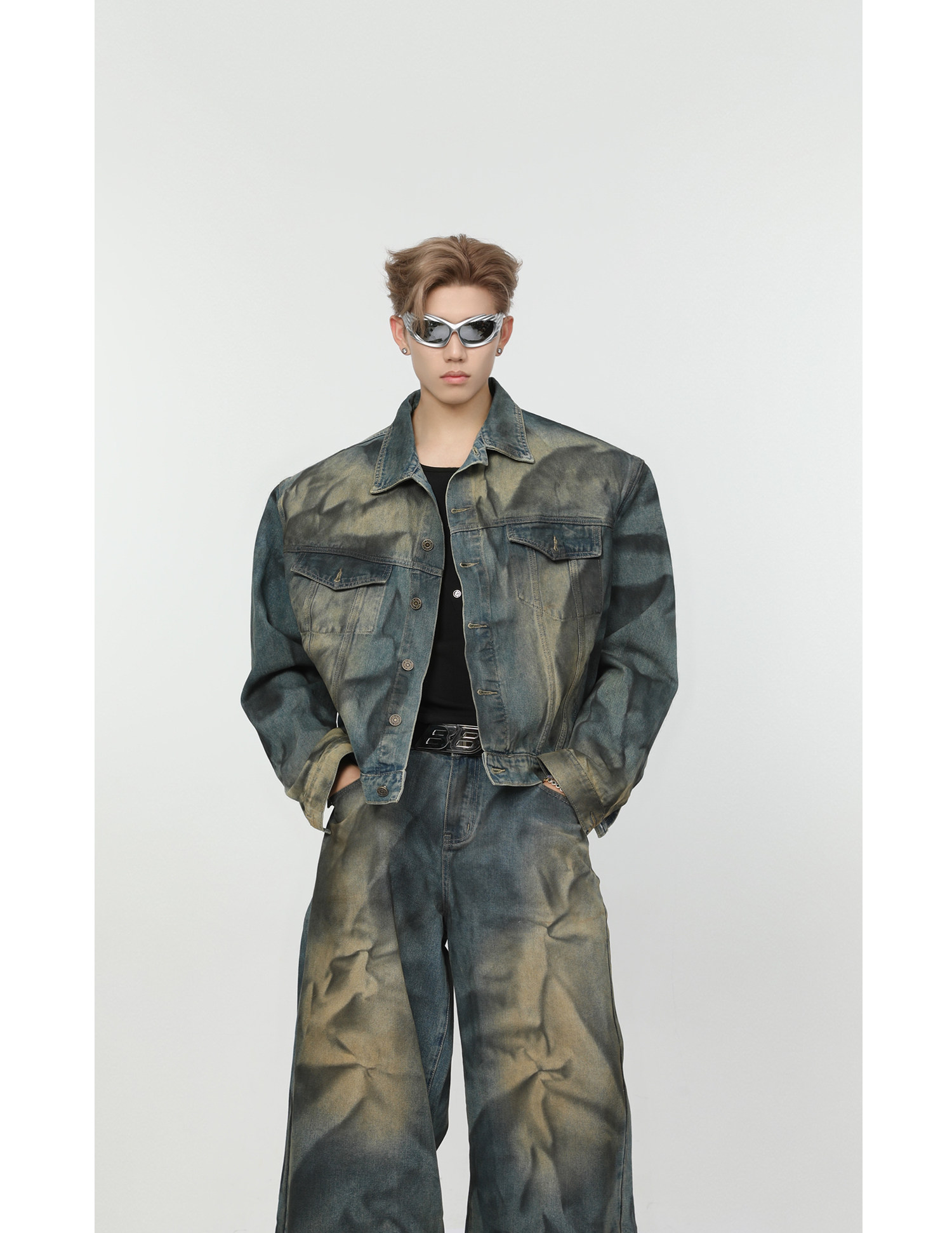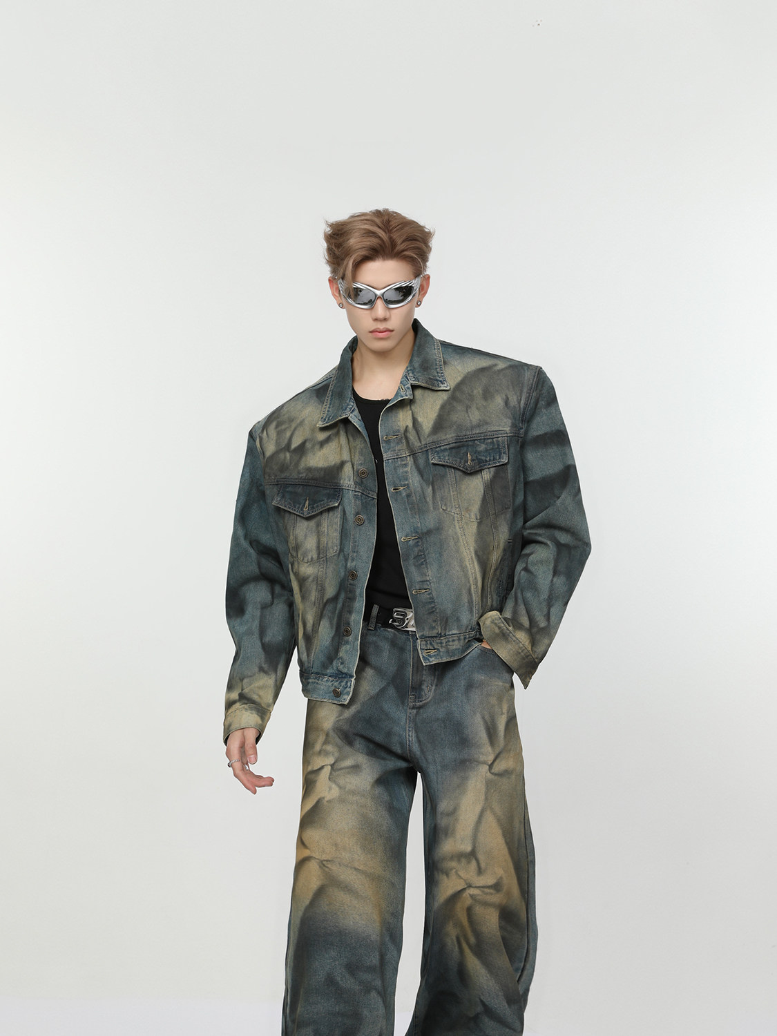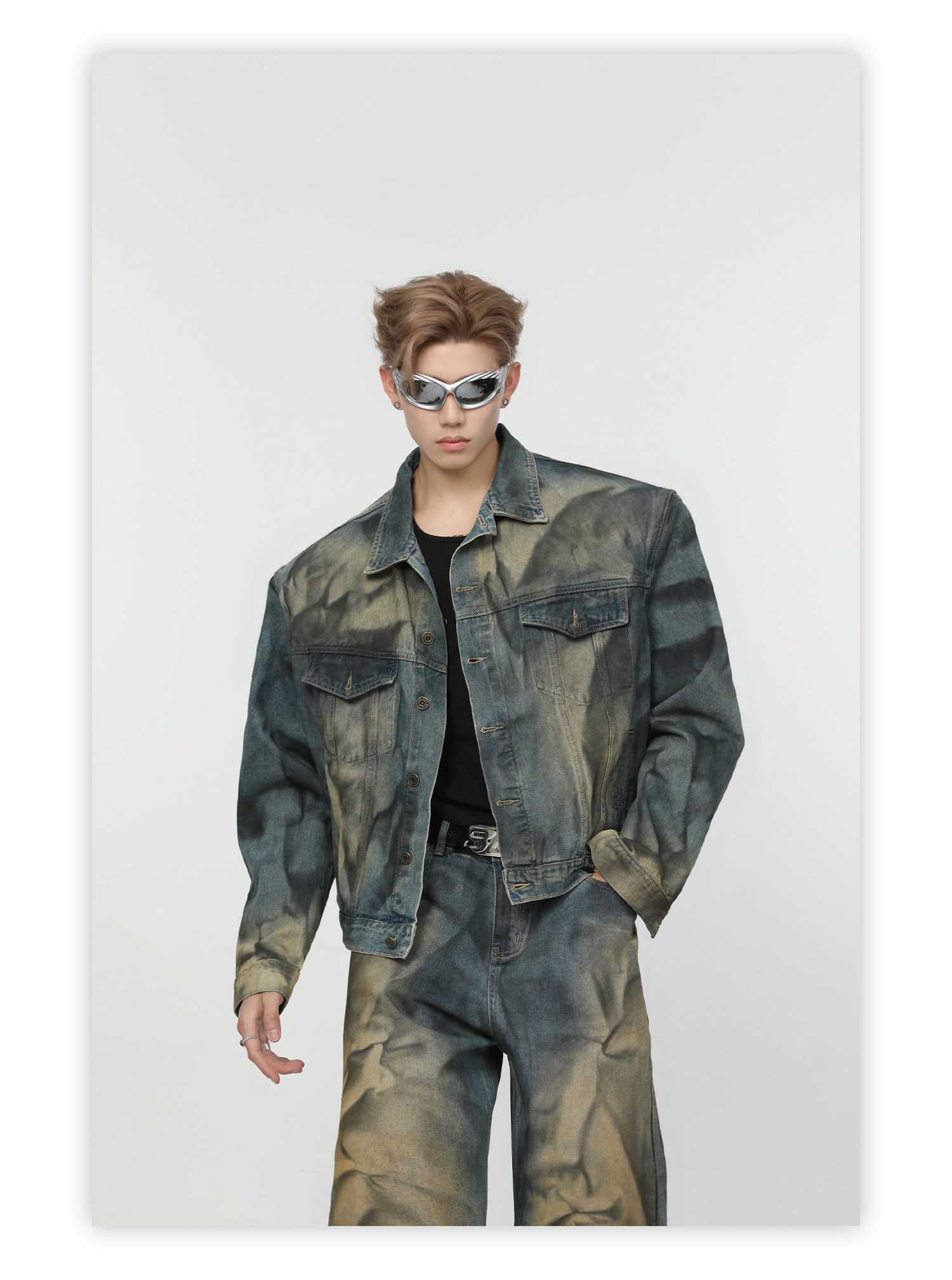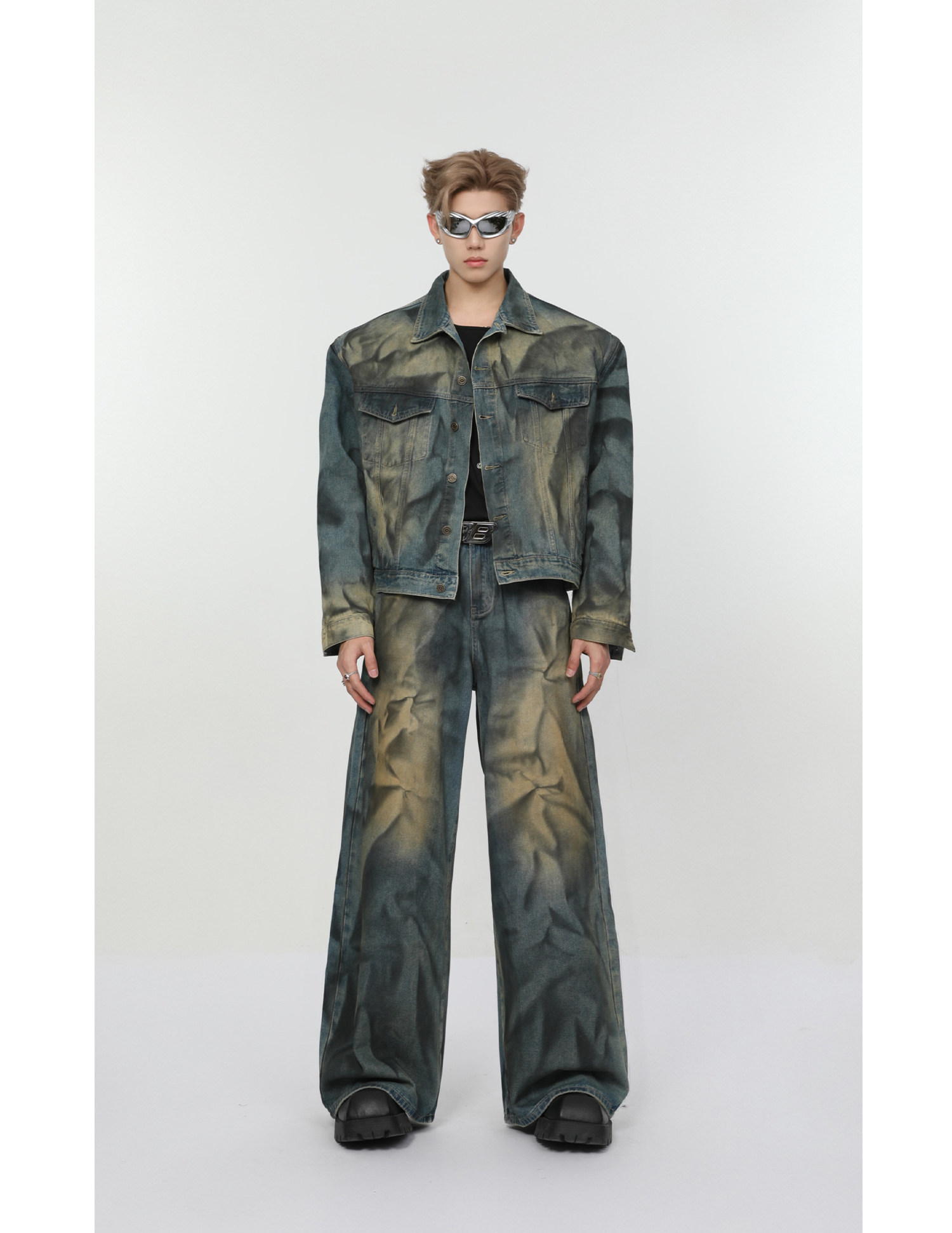 Ретро джинсовый комплект, наплечники, куртка, штаны, свободный прямой крой