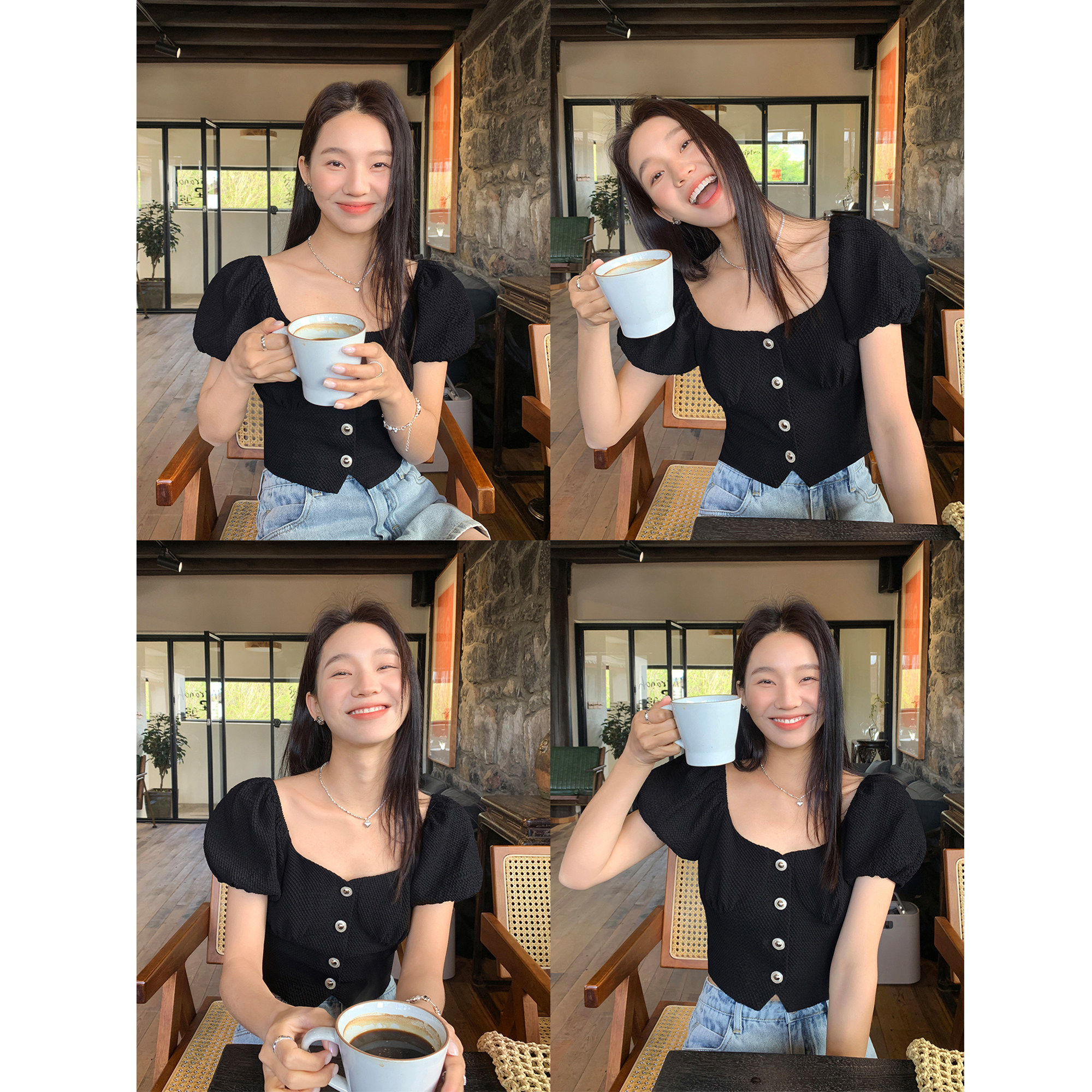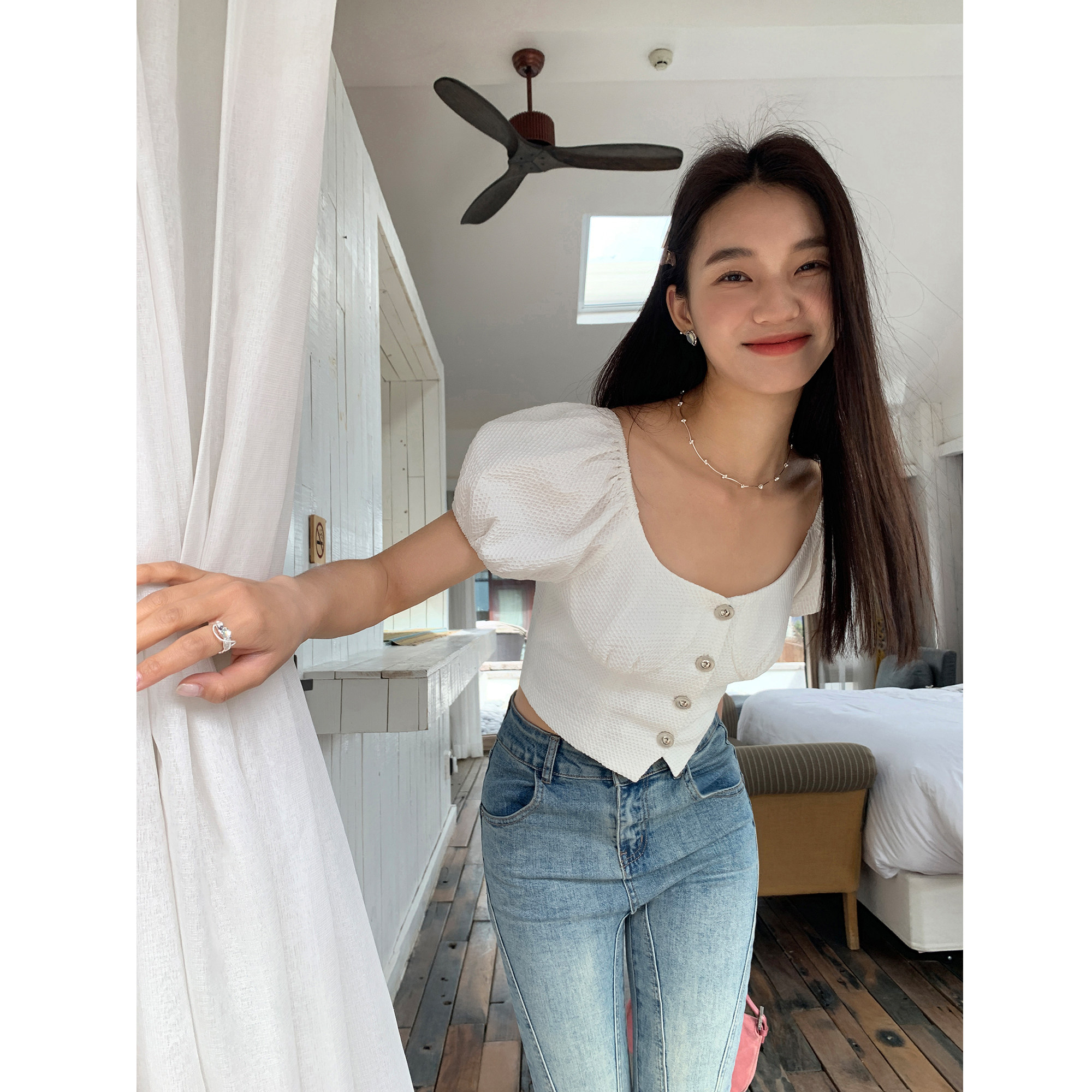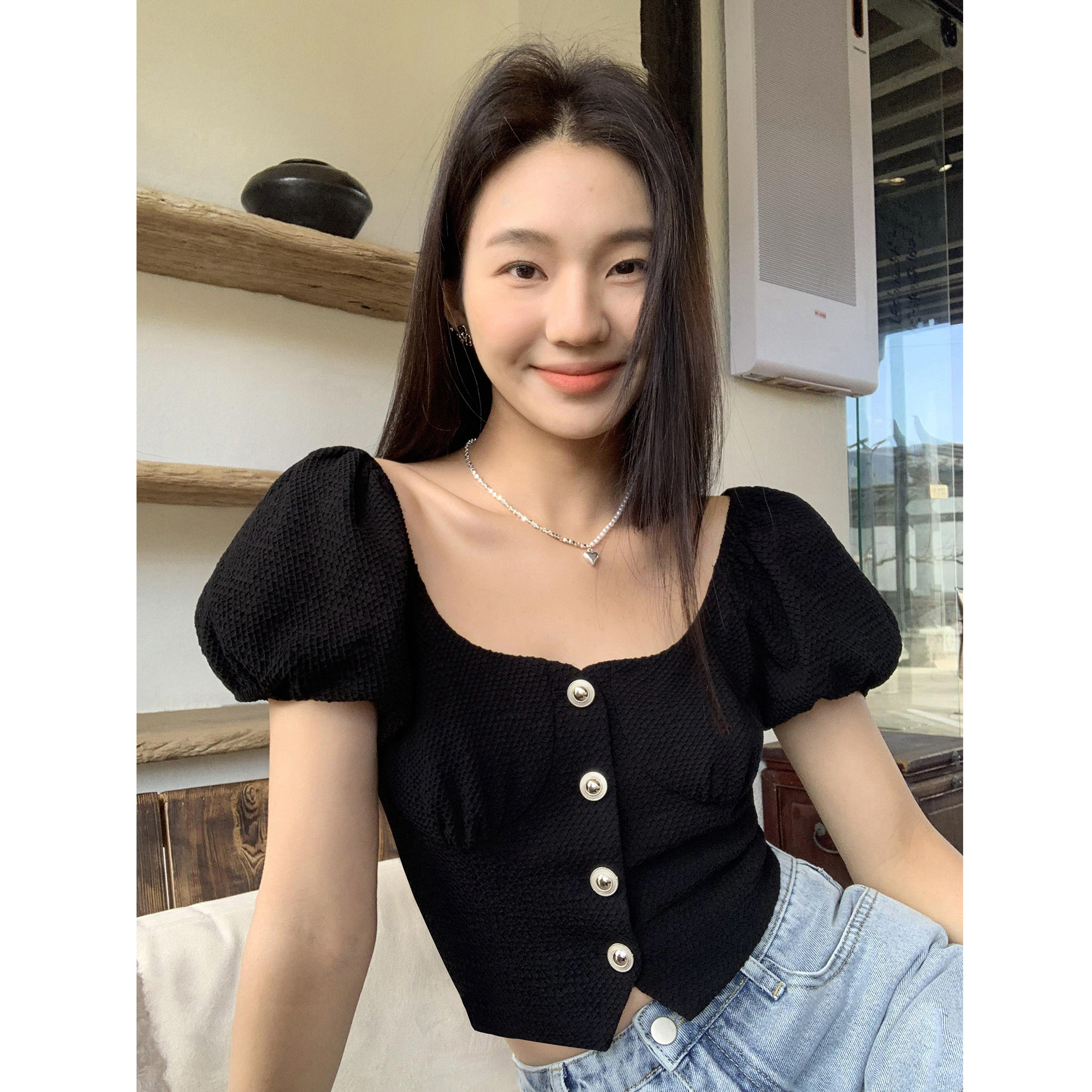 pusumede Летняя короткая рубашка, французский стиль, квадратный вырез, премиум класс, яркий броский стиль, облегающий крой