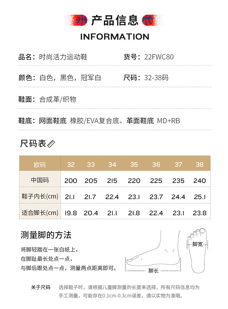 | Размер обуви: | 32 (длина футов 19,8/внутри 21,1), 33 (20,4/внутри 21,7), 34 (21,1/внутри 22,4), 35 (21,8/внутри 23.1) |