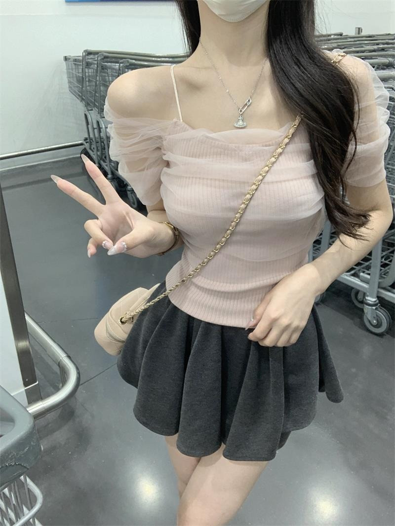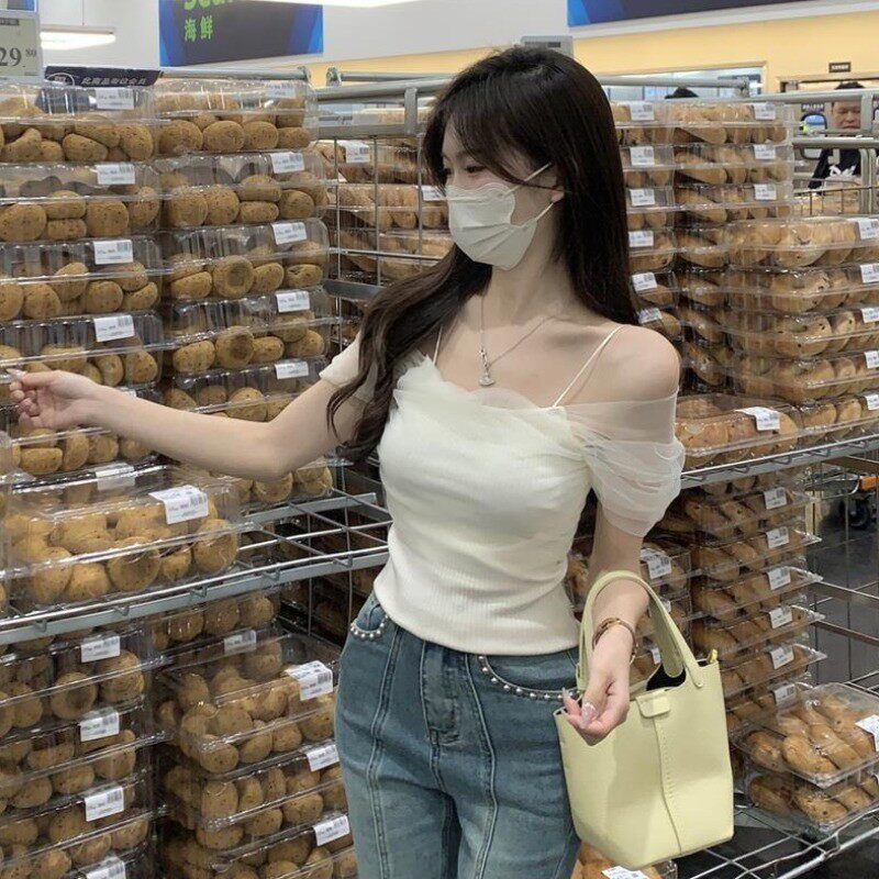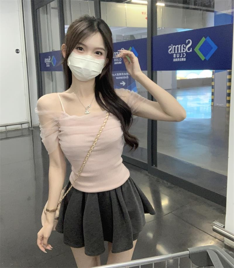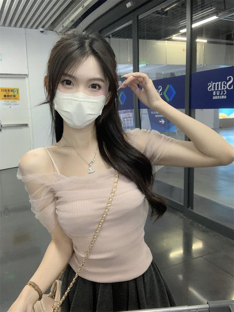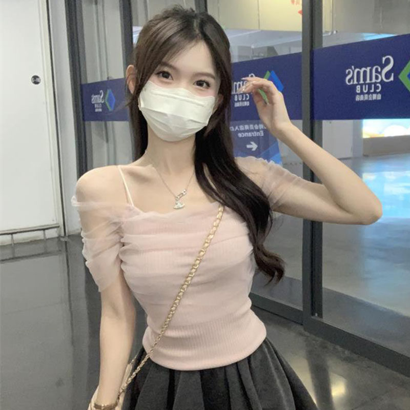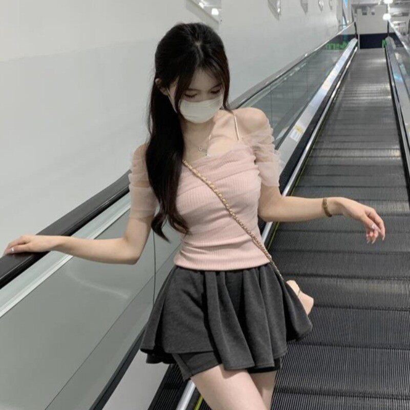 Розовая короткая милая футболка с коротким рукавом, открытые плечи, эффект подтяжки, высокая талия