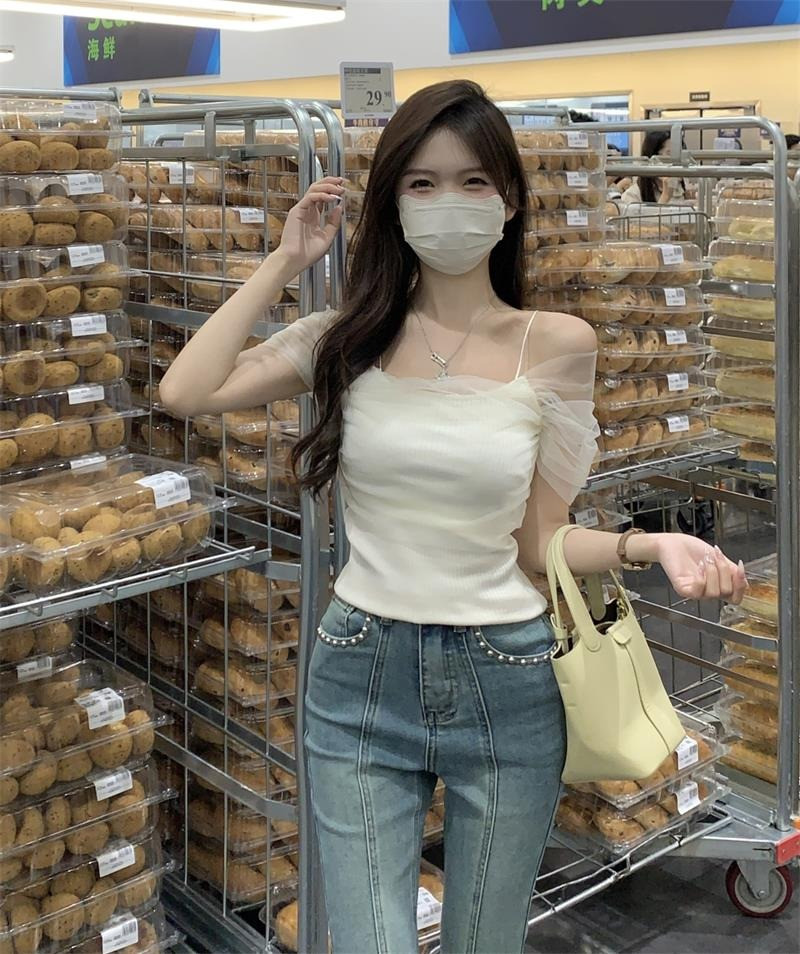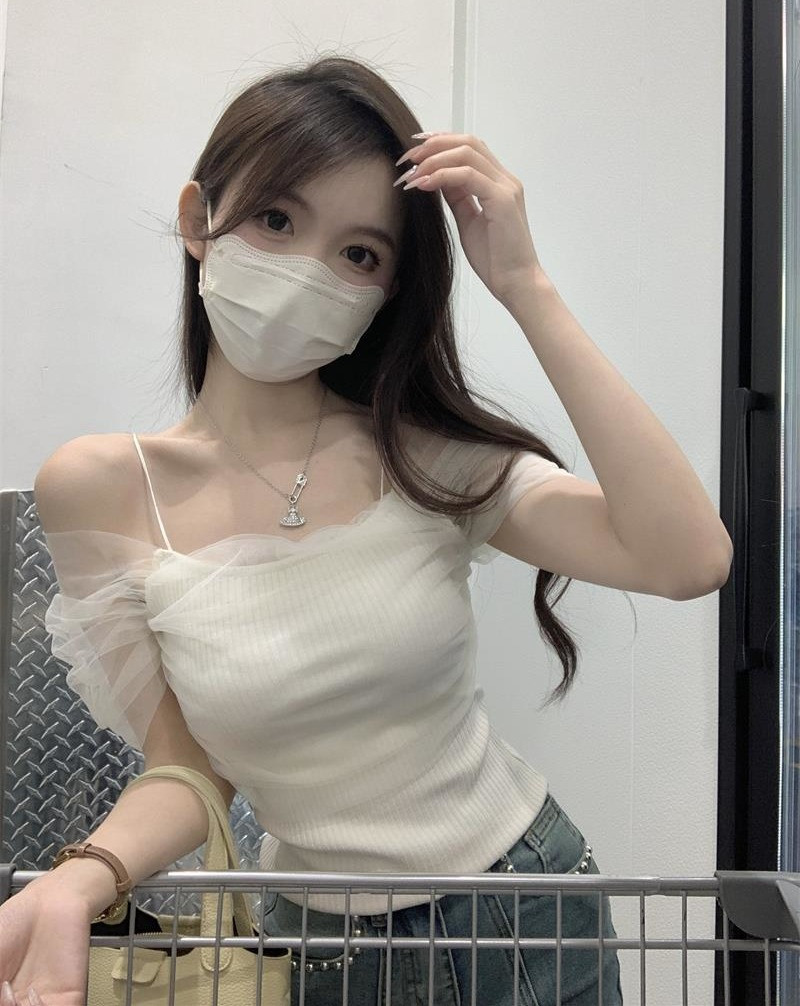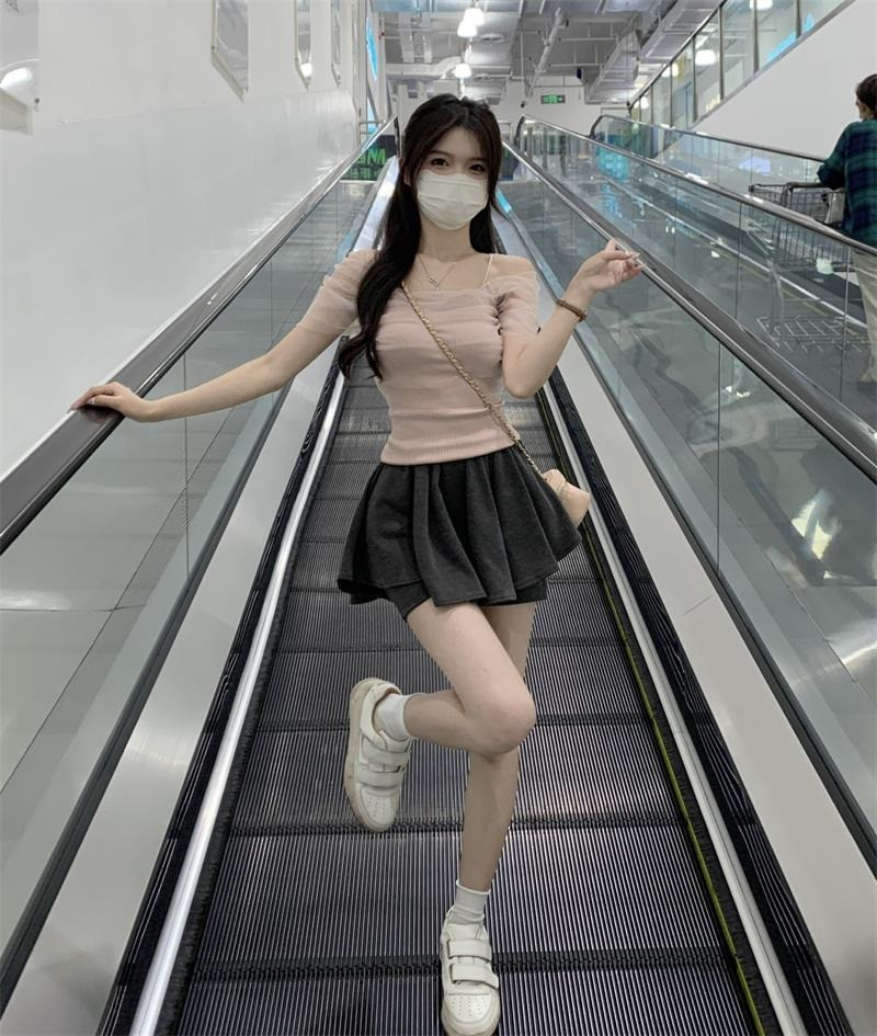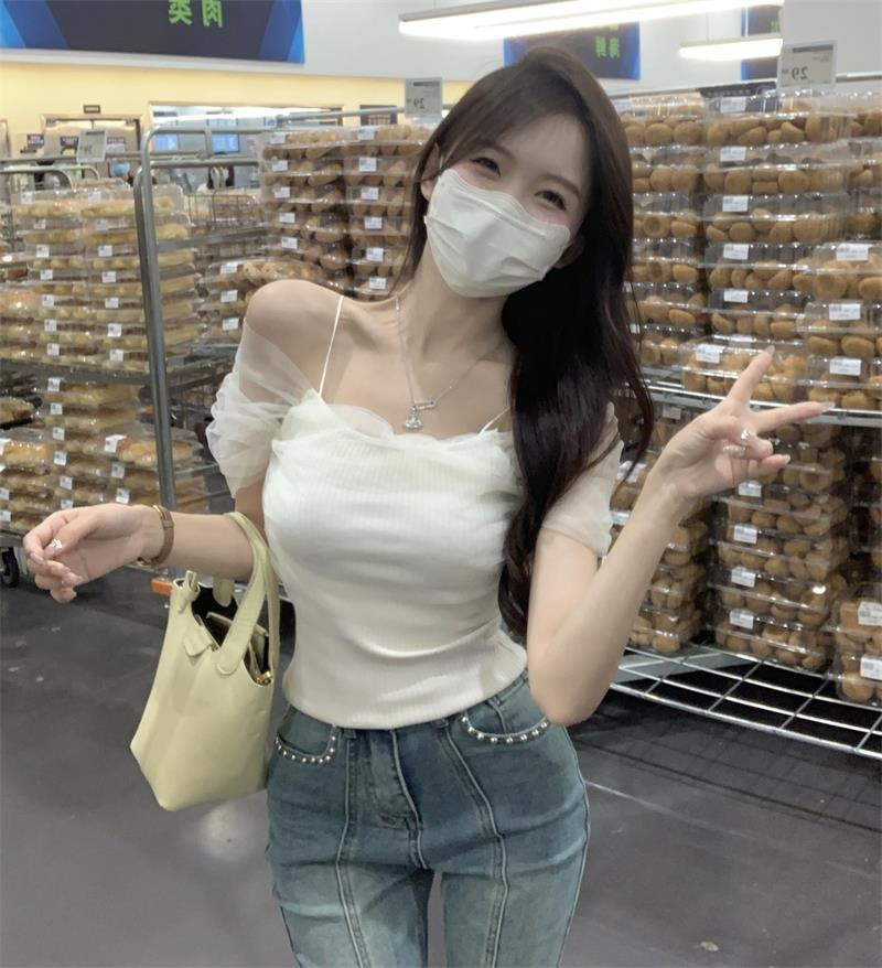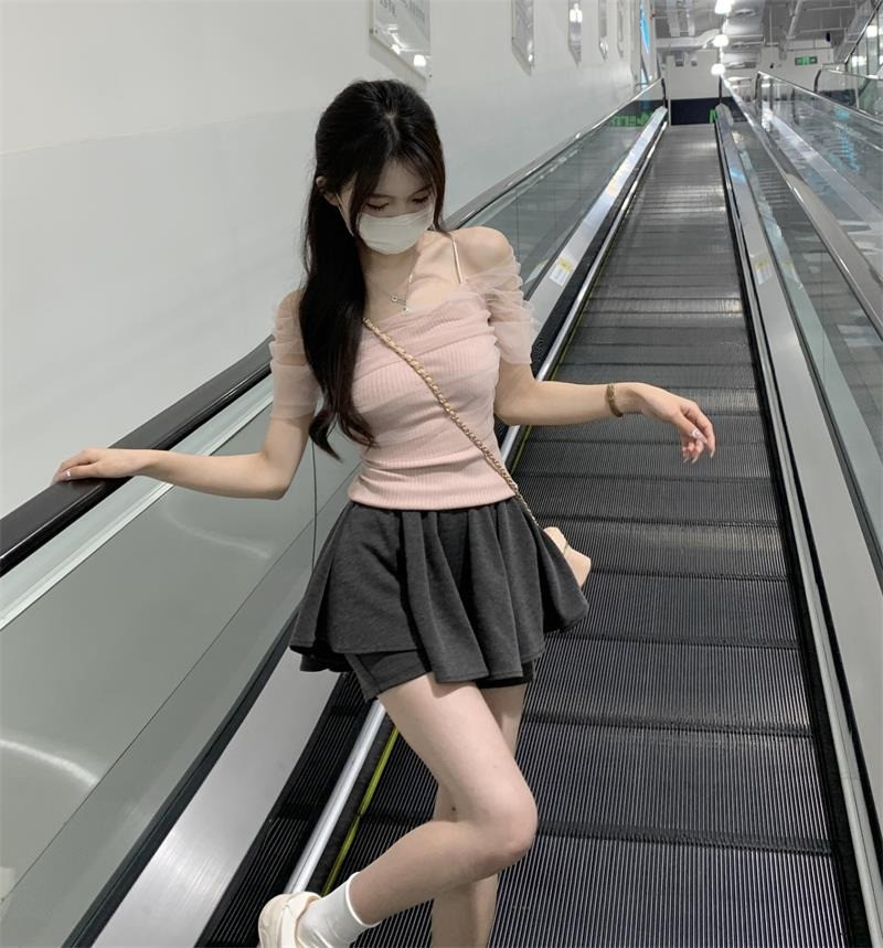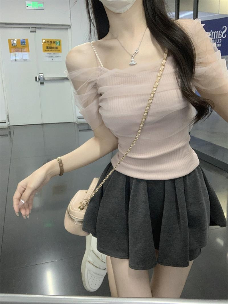 Розовая короткая милая футболка с коротким рукавом, открытые плечи, эффект подтяжки, высокая талия
