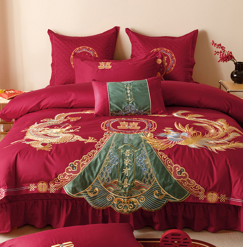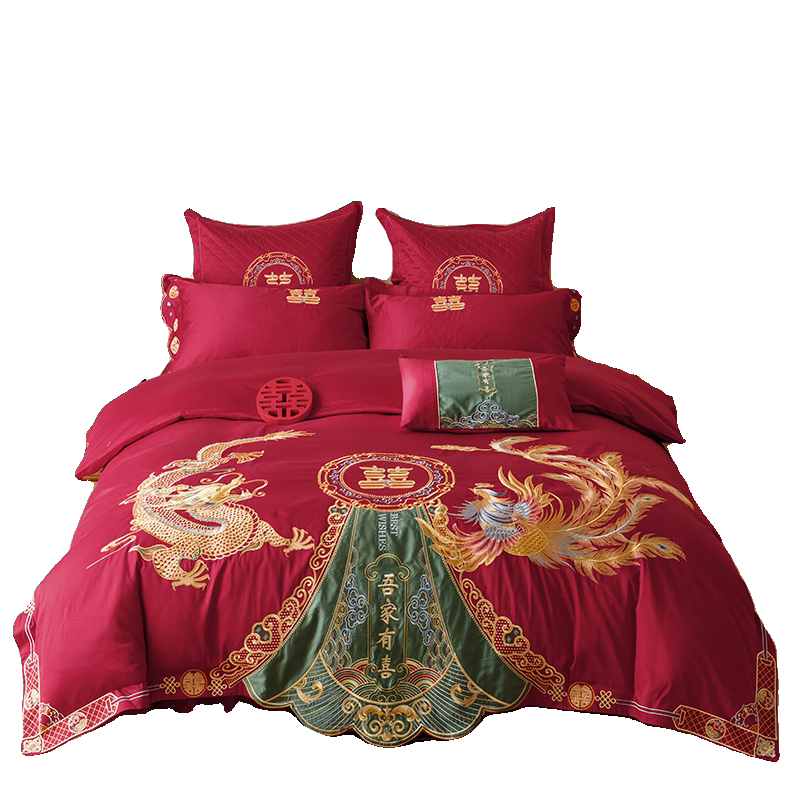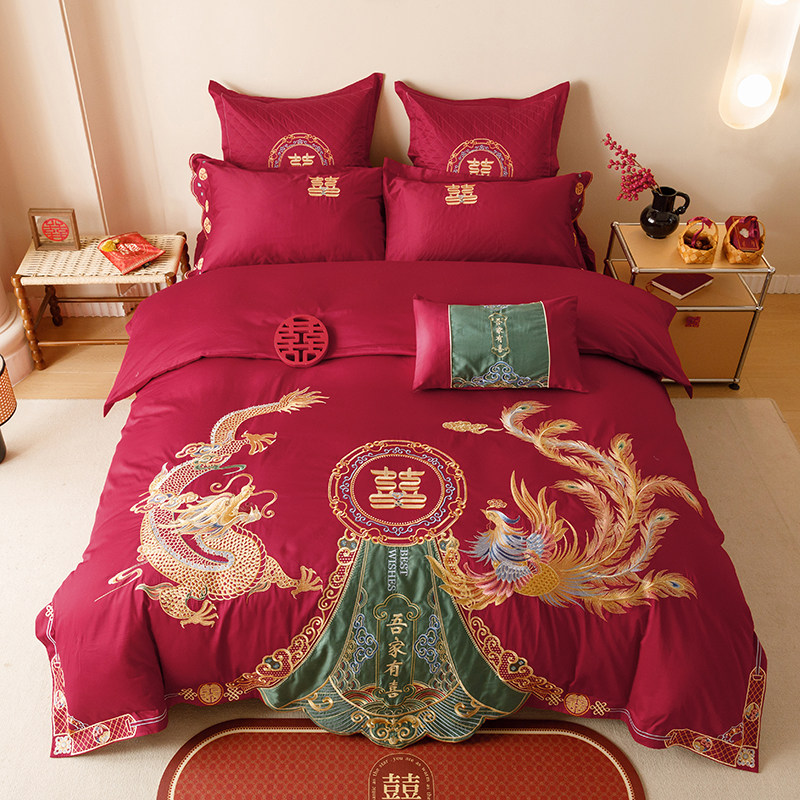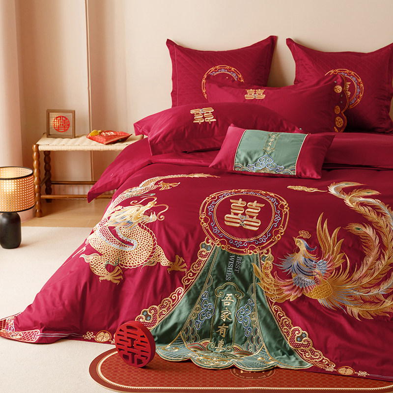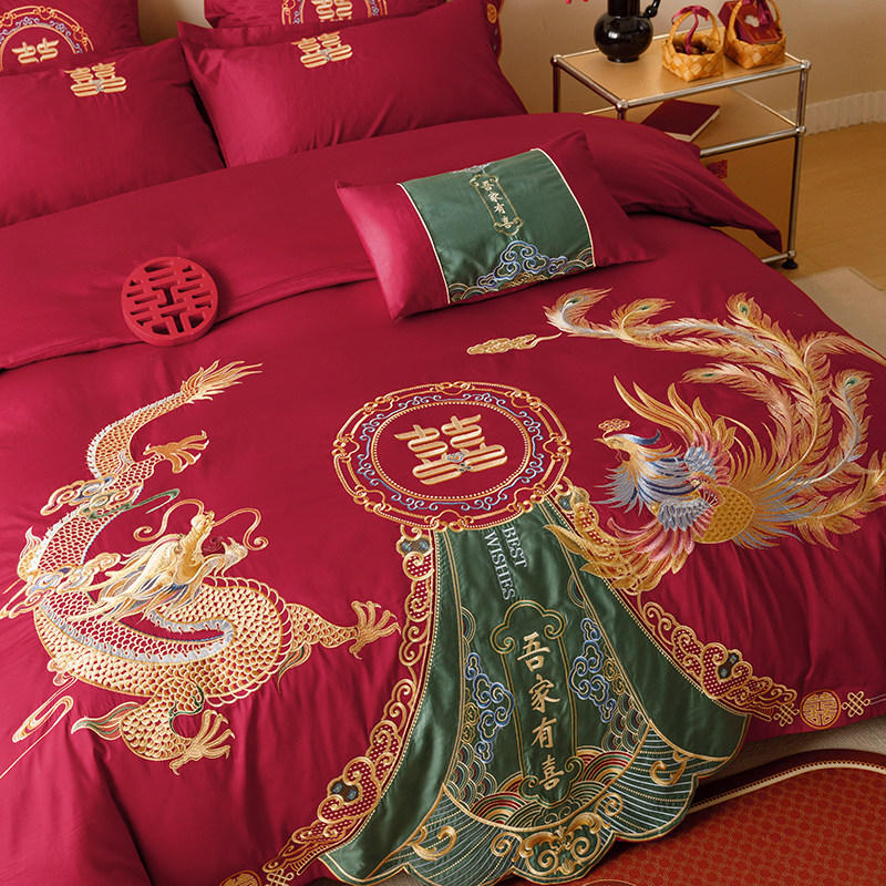 Хлопковый комплект, красный пододеяльник, 4 предмета, 100 шт, дракон и феникс, с вышивкой, постельные принадлежности
